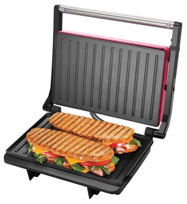 | Прочие особенности и свойства | Электрогриль - это отличный компактный прибор для быстрого приготовления горячих блюд. Для наилучшего пропекания в конструкции реализован равномерный прогрев рабочей поверхности с антипригарным покрытием.,,Не нагревающиеся ручки позволяют использовать устройство без риска обжечься, а система защиты от перегрева исключает повреждение прибора.,,Плавающая конструкция ручки позволяет достичь быстрой и равномерной прожарки блюд под прессом.,,Устройство снабжено индикаторами работы и нагрева, а также специальными ножками для устойчивости.,,Прибор занимает минимум места, даже если не используется, поскольку для него предусмотрена возможность вертикального хранения. |