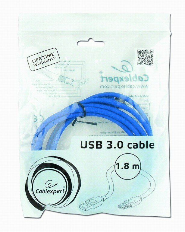 Для соединения внешних цифровых устройств с персональным компьютером?Позволяет увеличить длину интерфейсного соединения на 1,8 м?Предназначен для удлинения USB-кабеля всех стандартов (3.0, 2.0, 1.1)?Литая конструкция разъёмов препятствует преждевременному износу?Позолоченные разъёмы обеспечивают повышенную надежность соединения?Экранирование алюминием защищает от потери сигнала?Технические характеристики?Кабель соответствует стандарту USB 3.0 SUPER-SPEED, скорость передачи данных: до 5 Гбит/с?Разъёмы: USB AM [папа] (для USB-порта компьютера) и USB AF [мама] (для основного кабеля USB)?Позолоченные контакты, толщина покрытия: 30 мкм?Литые разъёмы?Цвет: синий?Длина: 1,8 м