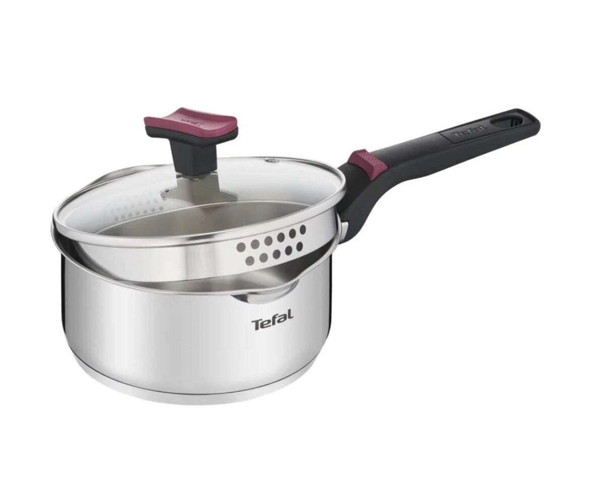 Отличный набор из двух кастрюль и ковшика. Порадовала в очередной раз компания Tefal новым удобным решением для удобного слива воды из кастрюль, на ручках есть подвижная часть, которая очень удобно и легко надвигается на крышку тем самым её фиксирует и можно теперь сливать воду не придерживая крушку полотенцем и пальцами как раньше не боясь обжечься!