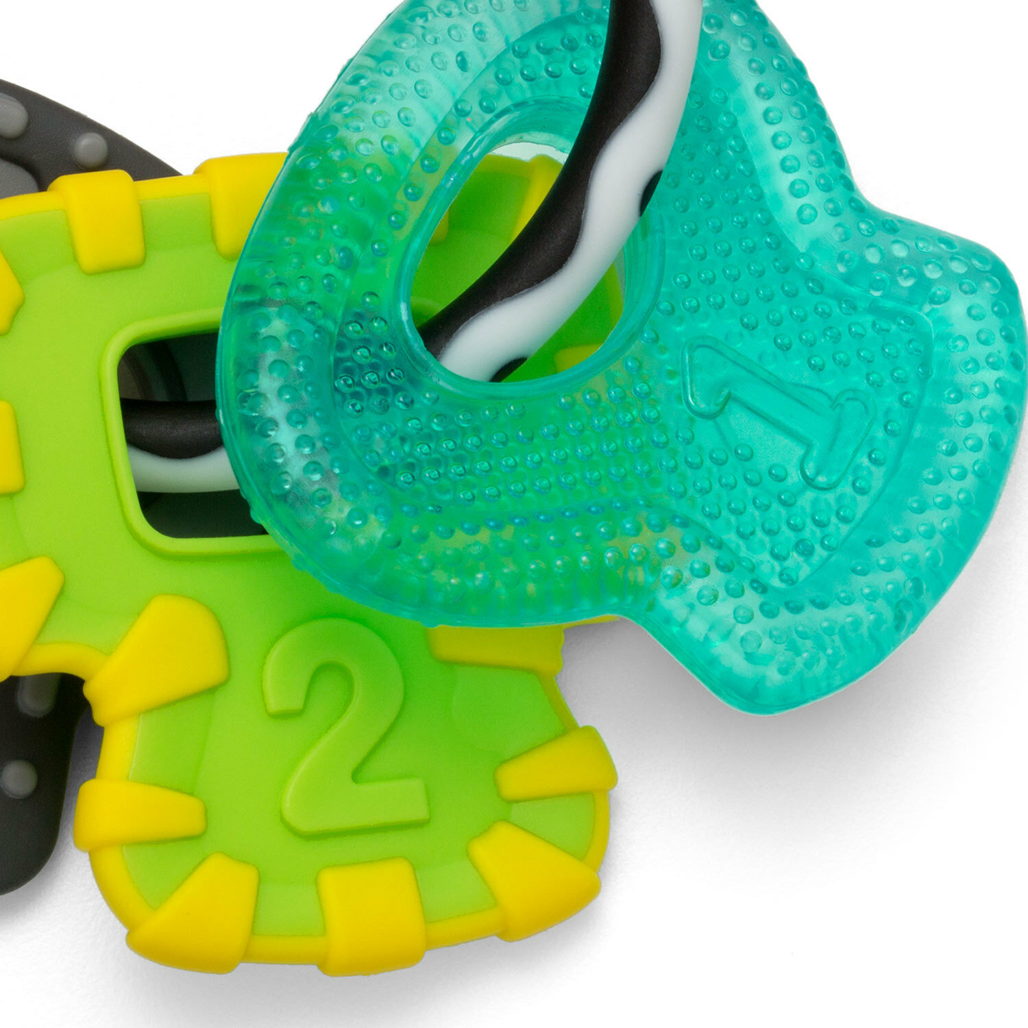 Прорезыватель имеет набор ключей с различными текстурами, а также бусины, которые вращаются и гремят.