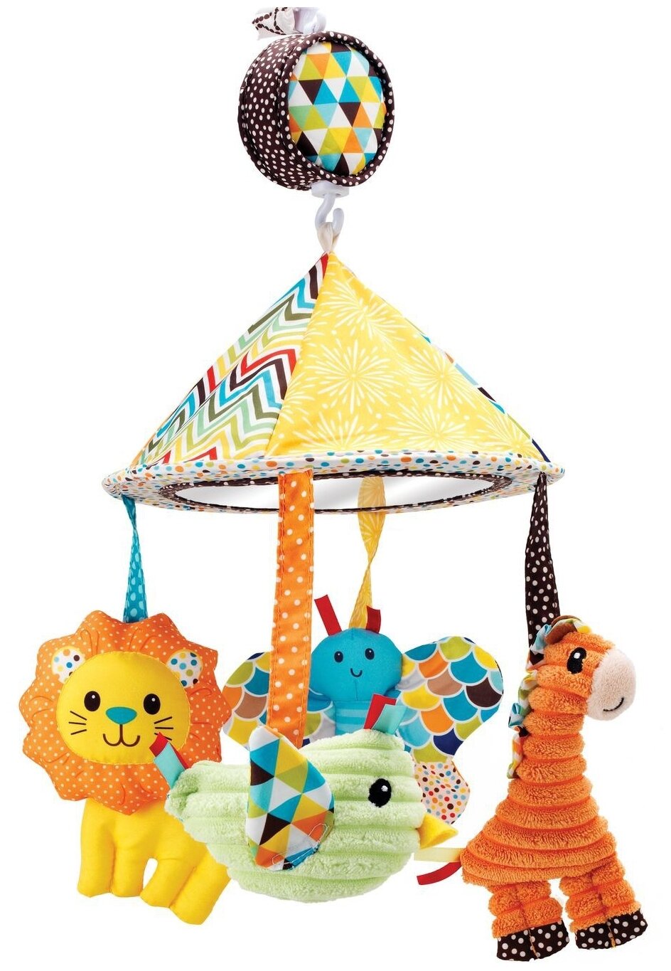 Мобиль Infantino Дружные зверюшки Gogaga с чудесными зверушками и зеркальцем развлечет и успокоит малышей. Особенности: Улыбчивый львенок, милая бабочка, жираф и волшебная птичка выполнены из материалов с разными текстурами и геометрическими узорами. Они невероятно приятны на ощупь, поэтому кроха будет с интересом их изучать. Игры с мобилем разовьют цветовое и тактильное восприятие, мелкую моторику и расширят кругозор малыша Мобиль с легкостью крепится к кроватке и работает без батареек Стильная игрушка украсит детскую и принесет ребенку много ярких впечатлений. Размер мобиля: 20 x 13 x 72 см.