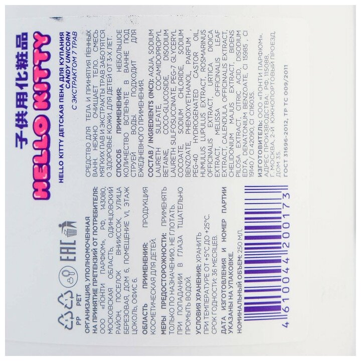 Пена для купания Hello Kitty с ароматом клубничного печенья и экстрактом 7 трав 250мл Ponti Parfum (4610044200173)