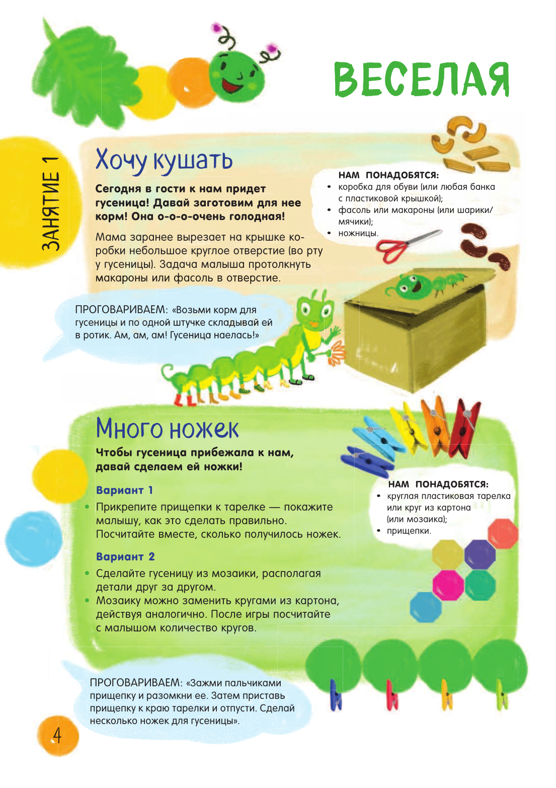 Всего в книге 15 блоков по 4 игры, это получается 60 игр. Малыши быстро устают, поэтому, даже если делать по 1-2 игры-урока в день, книги хватит как минимум на месяц. И вместо скучных советских развивашек – море эмоций для ребенка и для мамы. При этом предметы для игр найдутся в любом доме – вата, бумага, ножницы, коробка для обуви, овощи.