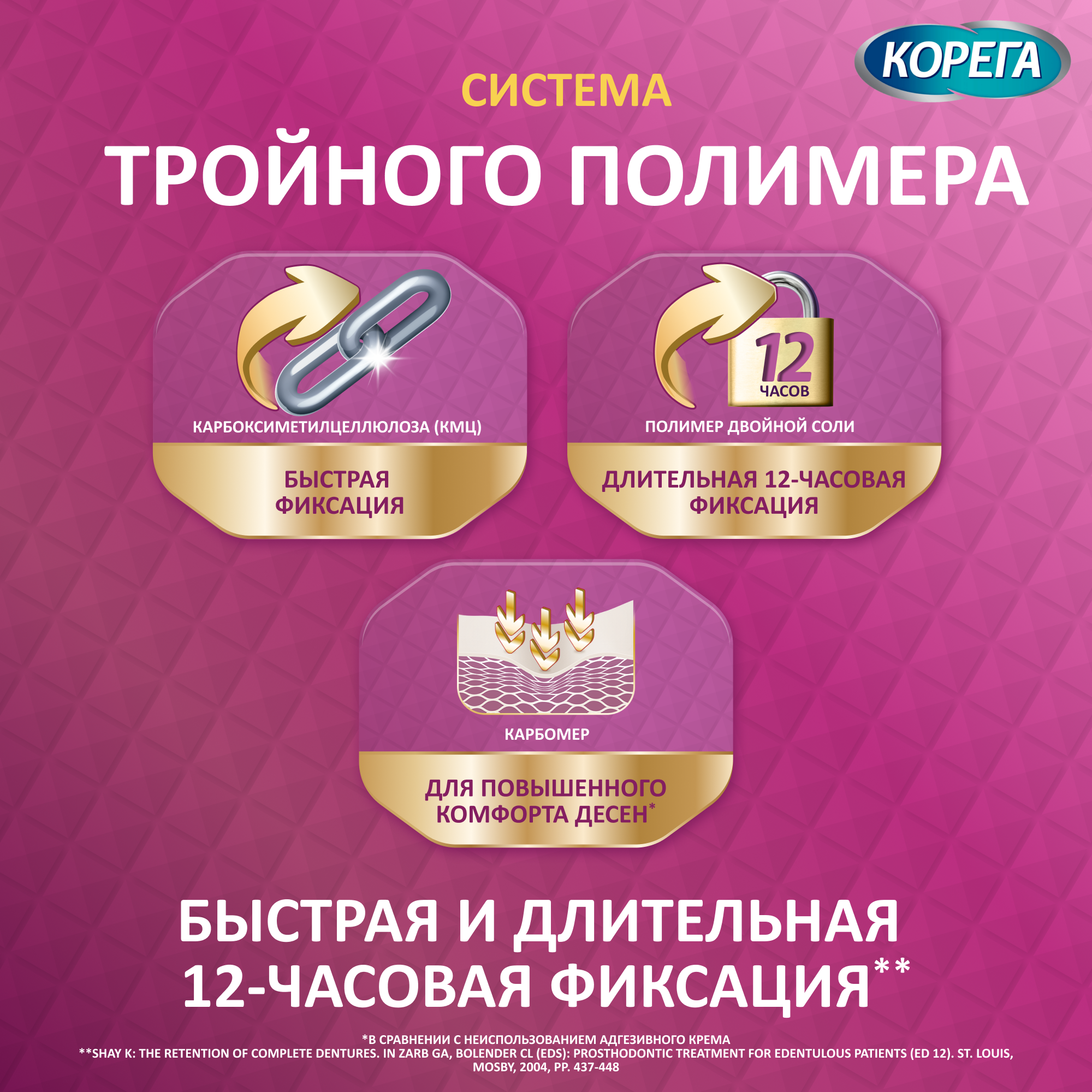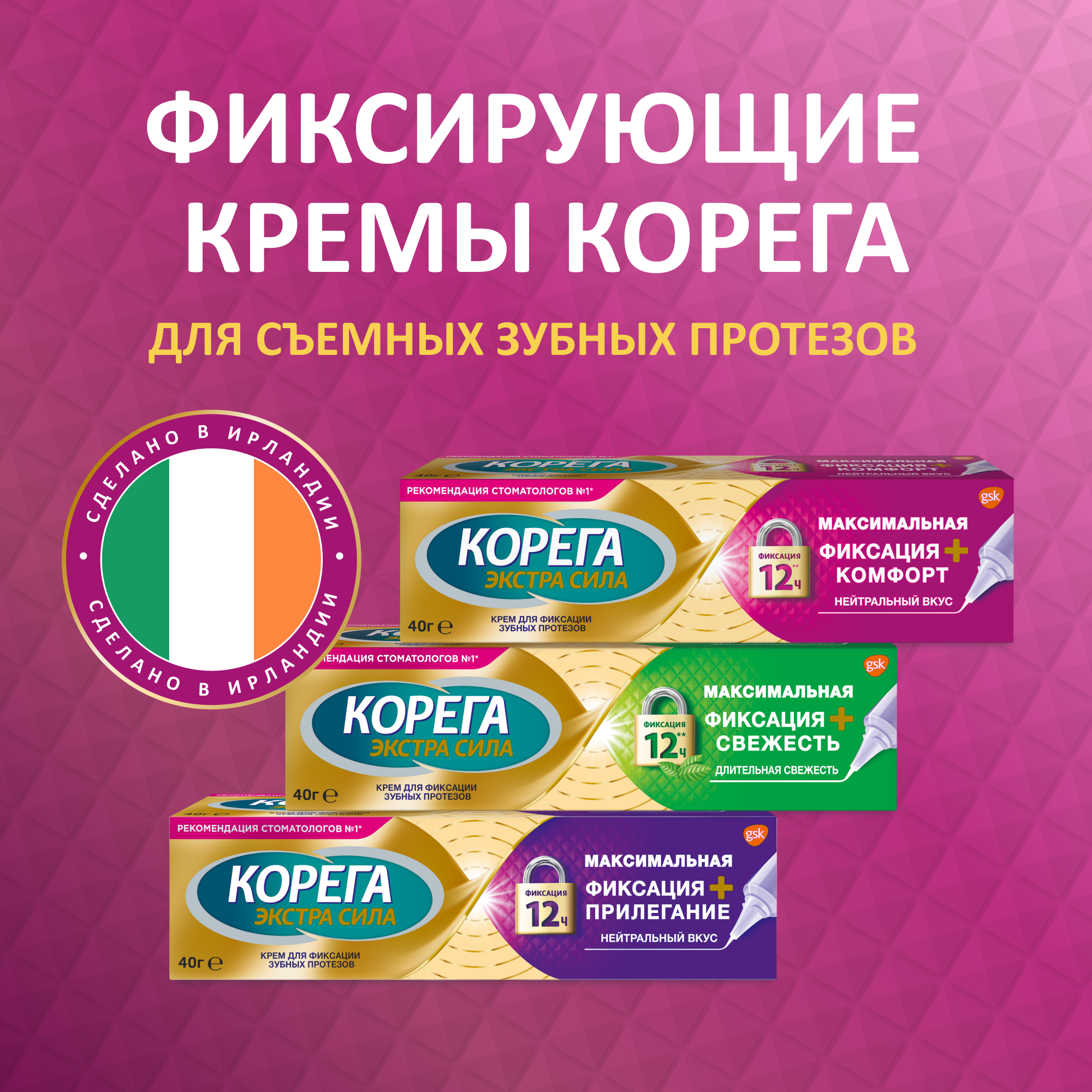Corega Корега Комфорт крем для фиксации зубных протезов, 40 г Преимущества:Крем для фиксации зубных протезов Корега Комфорт имеет уникальную формулу, созданную по технологии ADAPTAGRIP. Благодаря технологии ADAPTAGRIP, Крем корега Комфорт - это больше, чем просто крем для фиксации. За счет комбинации карбомера и карбоксиметилцеллюлозы, после смачивания слюной во рту образуется гель, который моментально начинает работать, формируя защитный слой. Смягчающий слой защищает десны от давления, трения и раздражения, которые могут спровоцировать протезы. Кроме того, обеспечивает комфортное удерживание протеза в течение всего дня. При первом применении используйте небольшое количество крема. Чрезмерное количество крема может просачиваться из-под протеза. Если это произошло в следующий раз используйте меньшее количество крема. Возможно потребуется несколько попыток, чтобы подобрать оптимальное количество. Используйте крем 1 раз в день для обеспечения комфорта в течение всего дня и надёжной фиксации. Если появляется необходимость использовать крем чаще, обратитесь за консультацией к стоматологу.