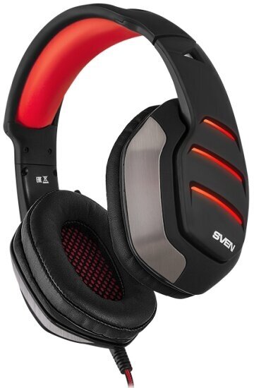 Sven - это эргономичная гарнитура, выполненная из качественного пластика с покрытием Soft touch, с мягким оголовьем и удобными амбушюрами. Сочетание черного и красного, металлические вставки на чашках и оголовье придают гарнитуре воинственный и брутальный вид. При желании можно включить подсветку чашек и микрофона с помощью удобного пульта, расположенного на кабеле. На пульте также находятся кнопки включения и выключения микрофона, регулировки громкости.