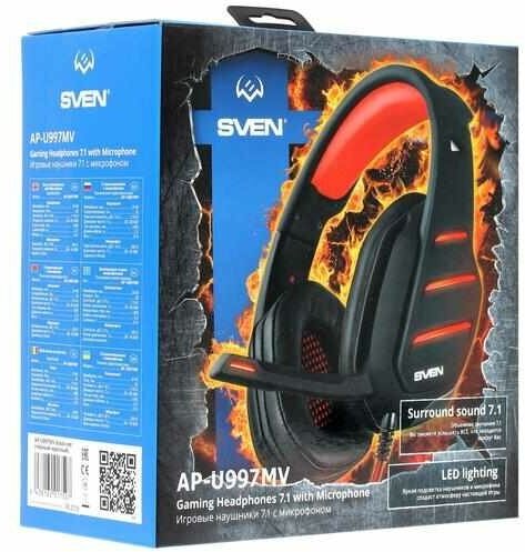 | Прочие особенности и свойства | Компания SVEN спешит порадовать профессиональных геймеров очередной классной моделью - гарнитурой AP-U997MV с объемным звучанием 7.1.,,Счастливый обладатель этой модели получит эргономичную гарнитуру, выполненную из качественного пластика с покрытием Soft touch, с мягким оголовьем и удобными амбушюрами. Сочетание черного и красного, металлические вставки на чашках и оголовье придают гарнитуре воинственный и брутальный вид. При желании можно включить подсветку чашек и микрофона. Сделать это очень легко с помощью удобного пульта, расположенного на кабеле в тканевой оплетке. На пульте также находятся кнопки включения и выключения микрофона, регулировки громкости.,,С помощью входящего в комплект программного обеспечения вы можете индивидуально настроить звук SVEN AP-U997MV. Высочайшее качество звучания этой гарнитуры позволяет вовремя заметить соперника, понять, где он прячется, и отразить его атаку. При этом крупные мягкие амбушюры наушников не пропускают посторонних шумов и позволяют полностью сосредоточиться на игре. |