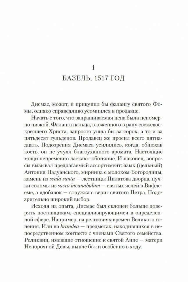 Итак, познакомьтесь с Дисмасом. Бывший швейцарский наемник, а теперь — официальный слуга двух господ: «поставщик святынь ко двору его преосвященства архиепископа Бранденбургского и Майнцского Альбрехта, поставщик святынь ко двору курфюрста Саксонии Фридриха Мудрого». Дисмас разбирается в священных реликвиях как никто другой, но не чужд и авантюрной жилки. И когда одна из Дисмасовых авантюр вскрывается, метящий в кардиналы Альбрехт делает Дисмасу и его подельнику Альбрехту Дюреру предложение, от которого невозможно отказаться: отправиться из Майнца в Шамбери, чтобы выкрасть из сокровищницы герцога Савойского одну из главных святынь христианского мира…