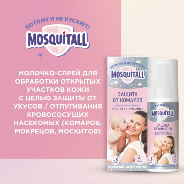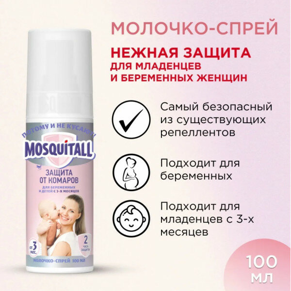 Молочко-спрей от комаров Mosquitall "Нежная защита для младенцев от 3 мес. и беременных" 100 мл - УНИКАЛЬНЫЙ продукт, подходит для младенцев от 3-х месяцев и беременным женщинам. Молочко-спрей надежно защитит Вашего малыша от укусов комаров, мошек, мокрецов и москитов во время прогулок. В состав средства входит IR3535 10% – действующее вещество нового поколения, самый безопасный из существующих репеллентов. Он является производным природной аминокислоты b-аланина и относится к БИО-репеллентам, не обладает запахом и не оставляет ощущения липкости на коже. Молочко-спрей 2 в 1 не только эффективно отпугивает комаров, но смягчает и увлажняет нежную кожу ребенка, а также снимает неприятные ощущения и зуд после укусов, способствует исчезновению покраснений, вызванных укусами насекомых.