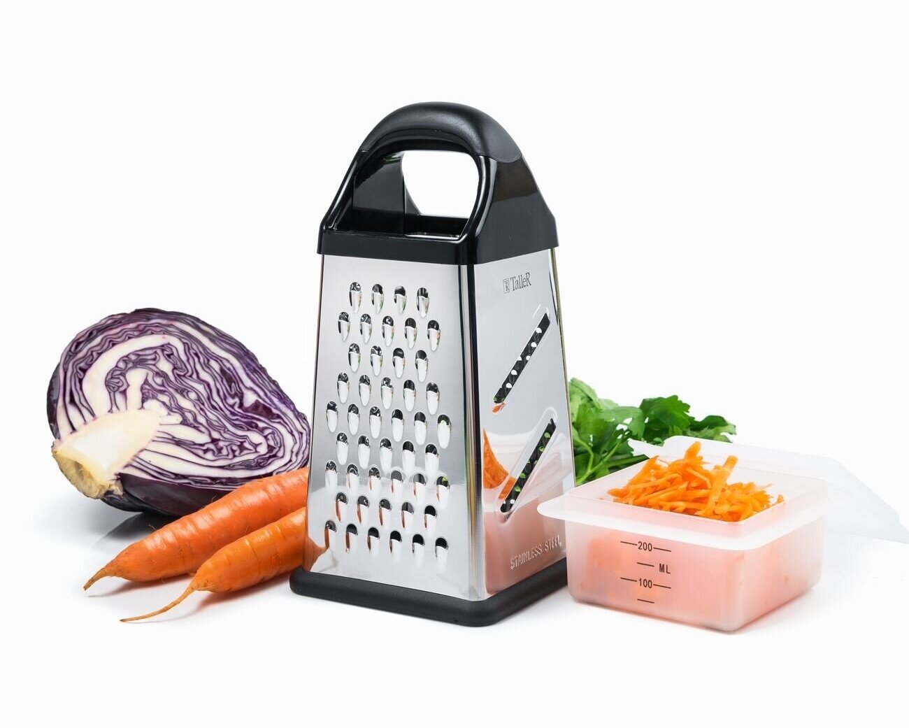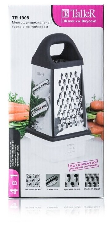 Терка TalleR с контейнером Размеры:высота 20,3 см, основание 10,5 х 10,5 см.Большая площадь рабочей поверхности.4 лезвия: крупная терка, средняя терка, мелка терка, шинковка.Съемный контейнер с крышкой обеспечивает порядок на рабочем пространстве и предохраняет продукты от обветривания.Специальная форма контейнера позволяет легко убирать его внутрь основания.Силиконовые протекторы на основании контейнера предотвращают скольжение даже на влажной поверхности.Можно мыть в посудомоечной машине.