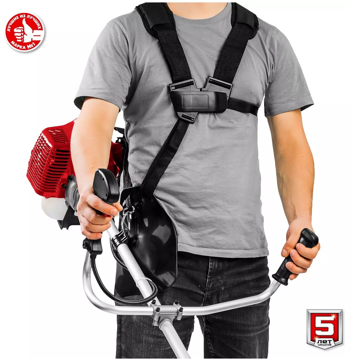 Это не просто бензиновый триммер, это кусторез, диск которого отлично пилит деревянную поросль. Во время кошения сохраняет мягкий ход без резких рывков, вибраций и шума. При работе не перегревается. Ремень добротный, со щитком от трения.