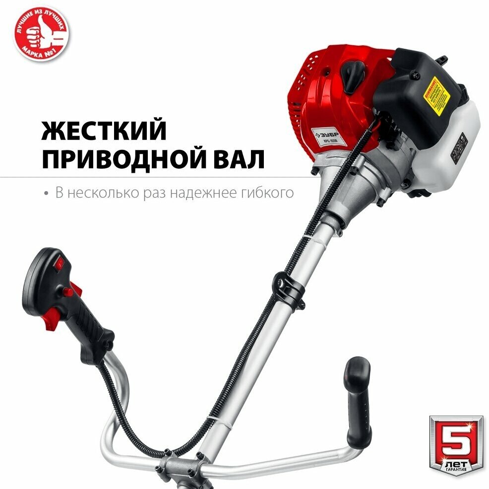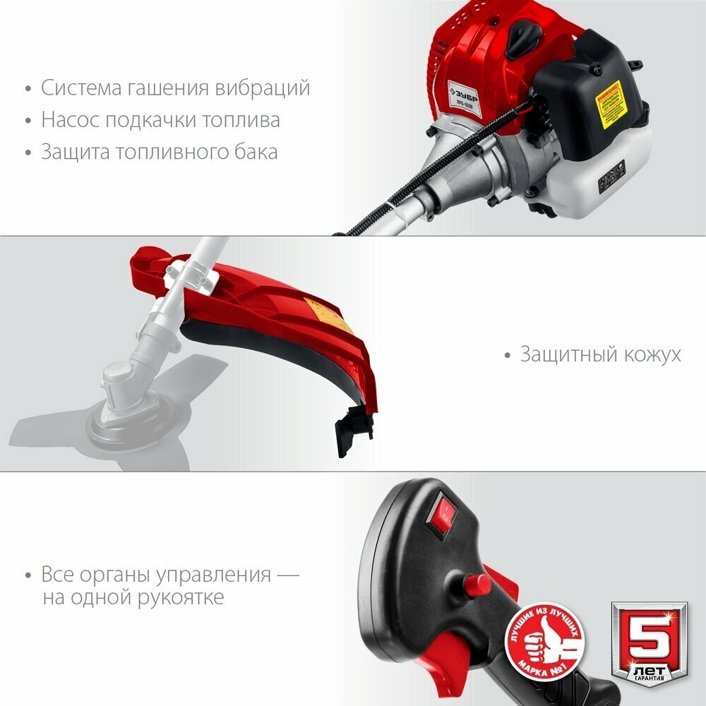 Триммер бензиновый (бензокоса) ЗУБР , предназначен для кошения растительности на садовых участках и газонах. Незаменимый помощник в делах по уходу за садовым участком. С помощью бензиновой косы можно легко и уверенно работать в самых стесненных условиях. Мощный двигатель позволяет, практически не прикладывая никаких усилий, подстричь траву, удалить одеревенелую поросль или подровнять кустарник около дома. Возможность установки как ножа, так и катушки с леской. Разъемная штанга для удобства хранения и транспортировки. Регулируемая по высоте велосипедная рукоятка. Плечевой ремень и оптимальная развесовка облегчают эксплуатацию. Двойная система гашения вибрации. Емкость для приготовления рабочей смеси в комплекте. Блокировка управления подачей топлива для безопасности оператора. Увеличенный ресурс двигателя благодаря высокотехнологичной обработке, двум компрессионным кольцам и хромовому покрытию цилиндра. Редуктор на выходе повышает крутящий момент.