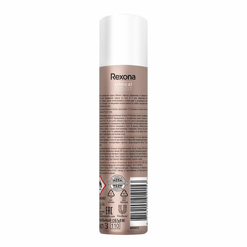 Состав товара:Isobutane, Cyclopentasiloxane, Aluminum Sesquichlorohydrate, Glycine, Propane, PPG-14 Butyl Ether, Parfum, Butane, Calcium Chloride, Disteardimonium Hectorite, BHT, Propylene Carbonate, Dimethiconol, Caprylic/Capric Triglyceride, Sodium Starch Octenylsuccinate, Maltodextrin, Hydrated Silica, Hydrolysed Corn Starch Octenylsuccinate, Gelatin Crosspolymer, Aqua, Sodium Benzoate, Silica, Cellulose Gum, Alpha-Isomethyl Ionone, Benzyl Alcohol, Benzyl Salicylate, Citronellol, Eugenol, Hexyl Cinnamal, Hydroxycitronellal, Limonene, Linalool.Меры предосторожности:Не наносите на поврежденную кожу. Прекратите использование при появлении сыпи или раздражения на коже. Огнеопасно! Оберегайте от действия прямых солнечных лучей и нагревания свыше +50°С. Не распыляйте вблизи открытого огня и раскаленных предметов. Баллон под давлением! Не разбирайте и не давайте детям. Избегать попадания в глаза. Не вдыхать. Использовать только в хорошо проветриваемых помещениях. Избегать длительного распыления. Не содержит озоноразрушающих веществ. Не деформировать, не разбирать и не сжигать баллон даже после использования. После использования утилизировать как бытовой отход.