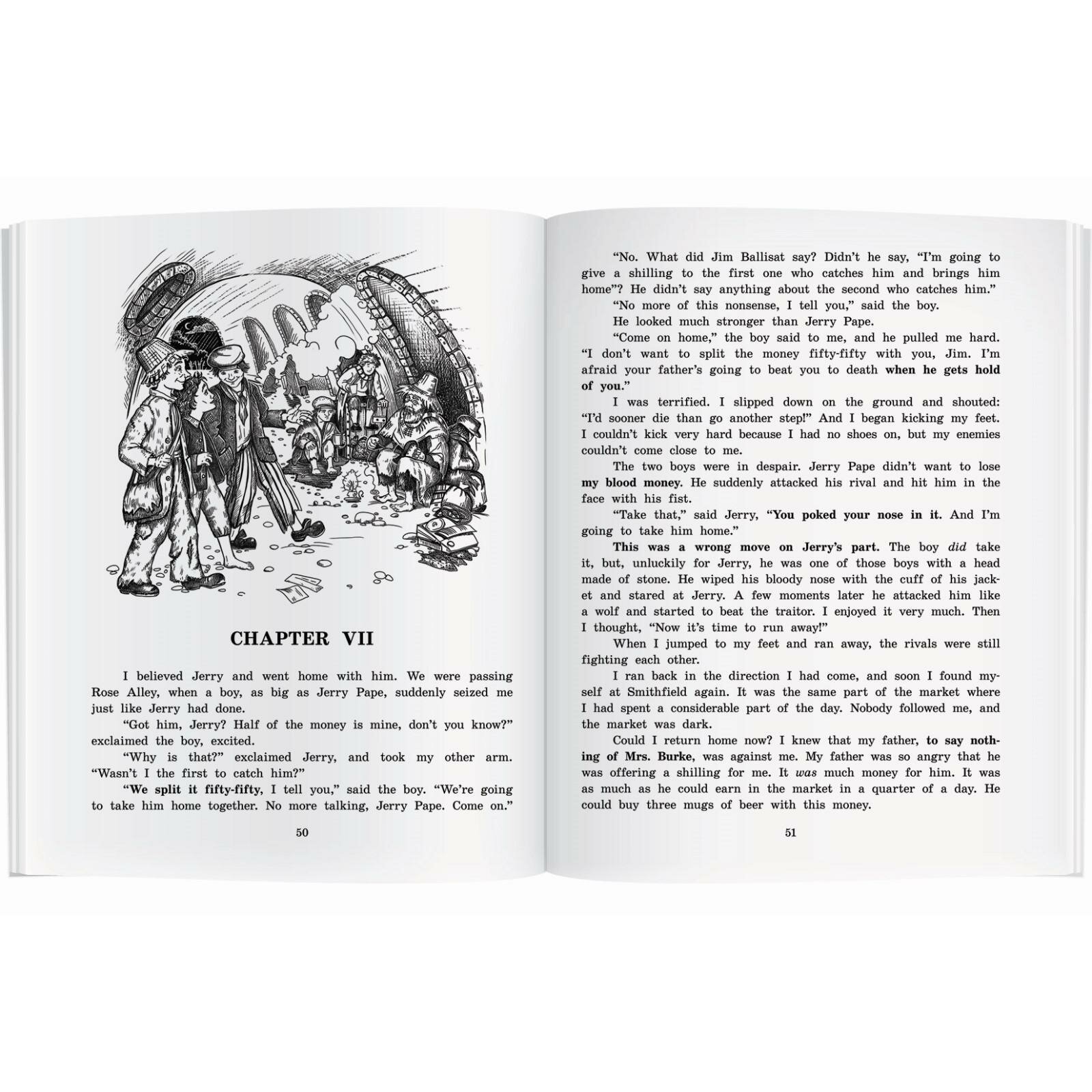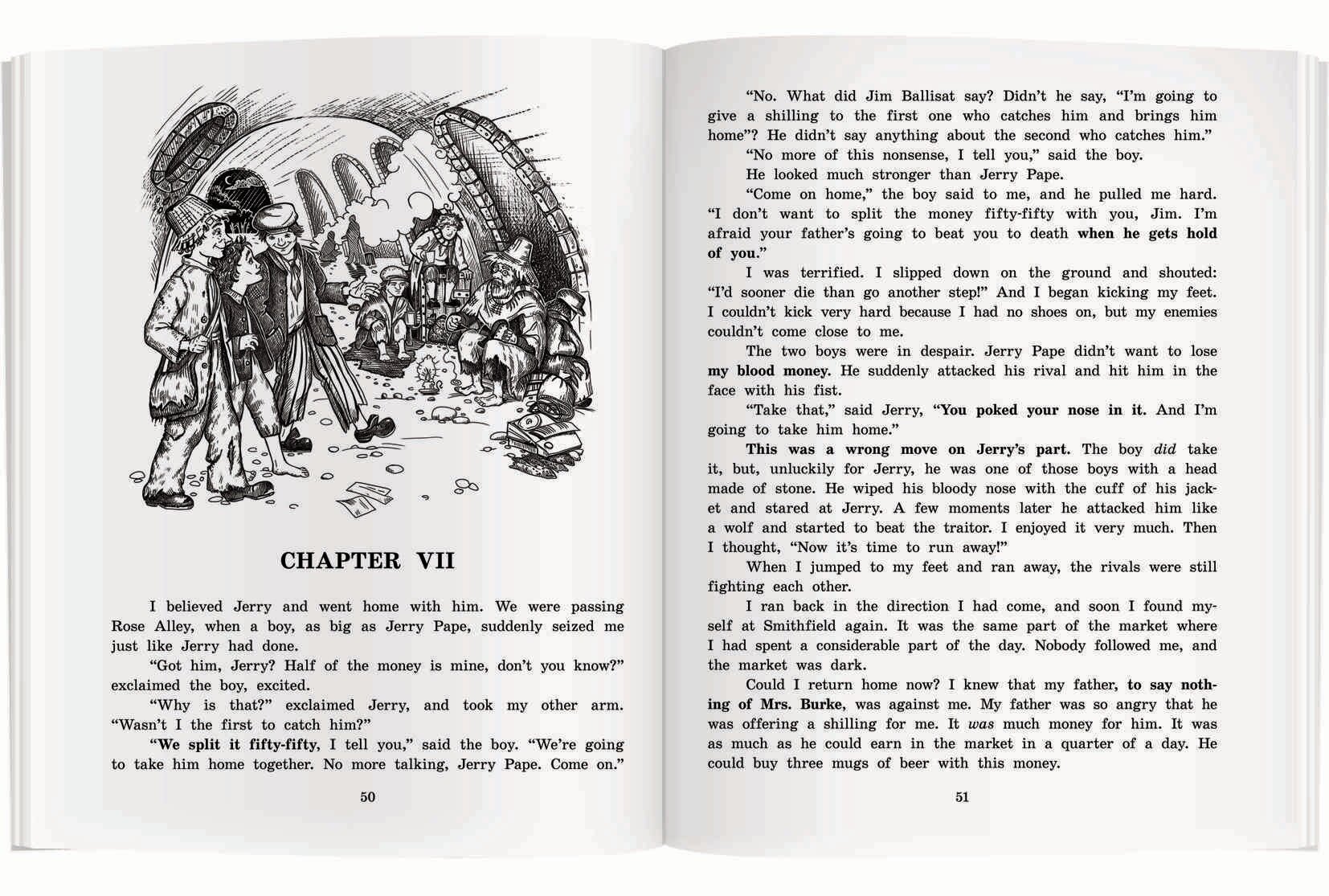 Книга представляет собой адаптацию романа известного английского писателя Джеймса Гринвуда (1833-1929) "Подлинная история маленького оборвыша" о мальчике по имени Джим, который вынужденно стал бродягой и воришкой, но сумел вернуться к честной жизни благодаря своей порядочности и помощи настоящих друзей.