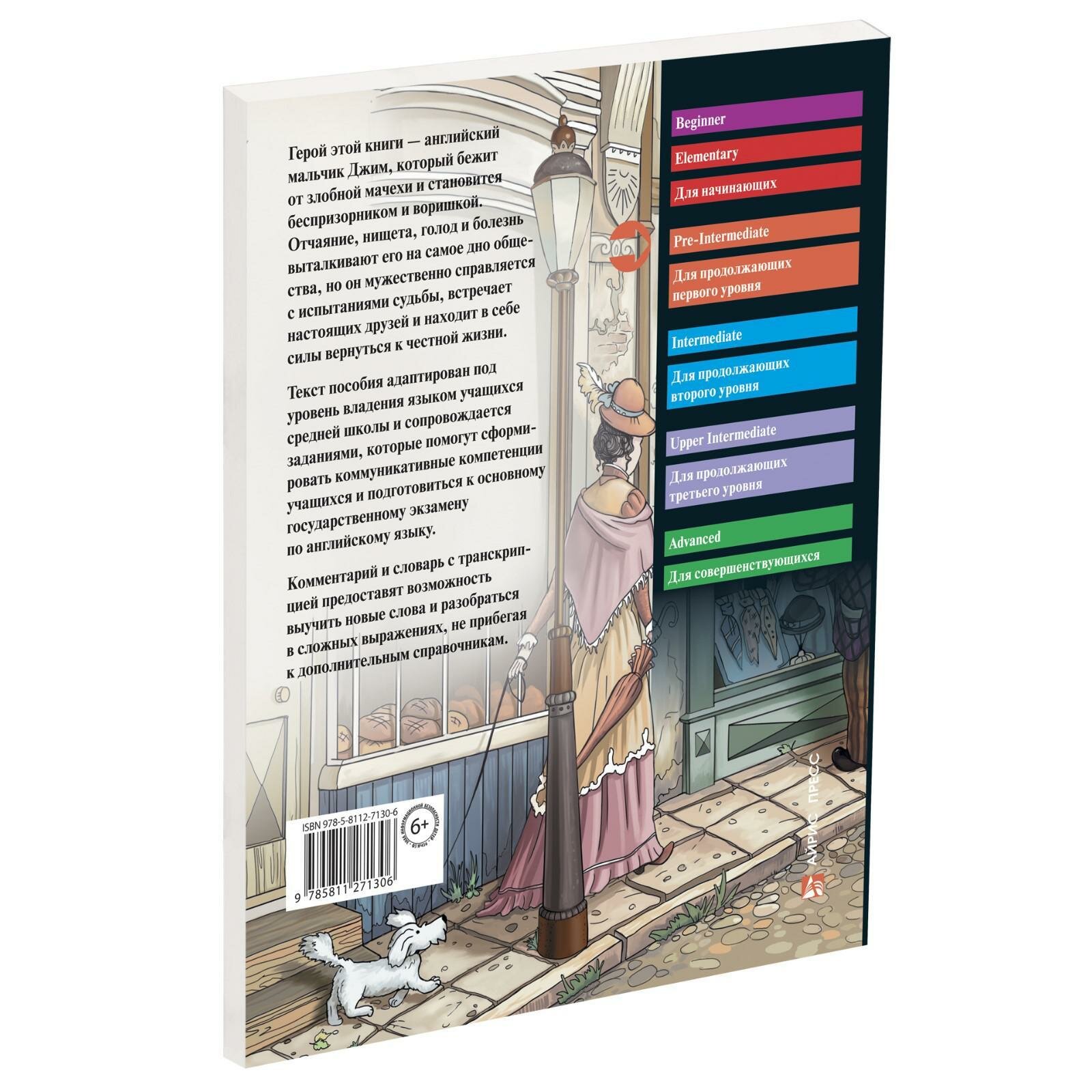 Добрый день! Трогательная, грустная история о мальчике Джиме, которому много приходится пережить и сталкиваться с различными ситуациями. Книга разделена на главы, части с новыми выражениями и словами, проверочными заданиями. В книге представлен словарик с транскрипцией, очень удобно учить новые слова. Книга в мягкой обложке, листы газетные. Книга полезна как дополнительный источник практики на английском для детей и взрослых. Спасибо.