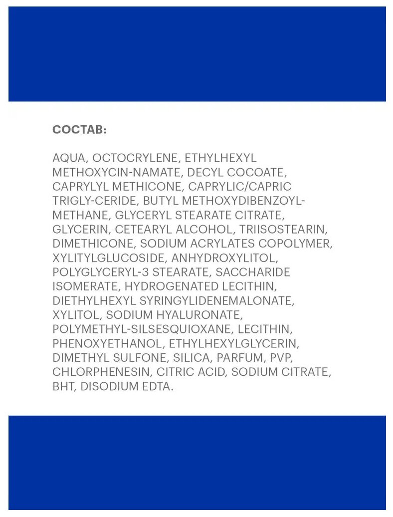 | Состав | aqua, оctocrylene, ethylhexyl methoxycinnamate, decyl cocoate, caprylyl methicone, caprylic/capric triglyceride, butyl methoxydibenzoylmethane, glyceryl stearate citrate, glycerin, cetearyl alcohol, triisostearin, dimethicone, sodium acrylates copolymer, xylitylglucoside, anhydroxylitol, polyglyceryl-3 stearate, saccharide isomerate, hydrogenated lecithin, diethylhexyl syringylidenemalonate, xylitol, sodium hyaluronate, polymethylsilsesquioxane, lecithin, phenoxyethanol, ethylhexylglycerin, dimethyl sulfone, silica, parfum, pvp, chlorphenesin, citric acid, sodium citrate, bht, disodium edta |