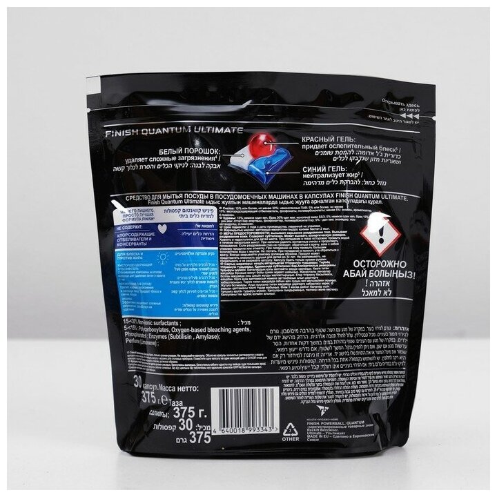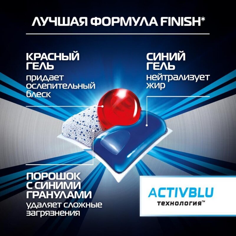 Трехкамерные капсулы нового поколения с двумя гелевыми компонентами для посудомоечной машины. Каждая капсула состоит из трёх частей: белый порошок удаляет сложные загрязнения, синий гель нейтрализует жир, красный гель придаёт ослепительный блеск. Finish Quantum Ultimate — лучшая формула в линейке Finish, которая позволяет каждый раз получать ослепительный результат.