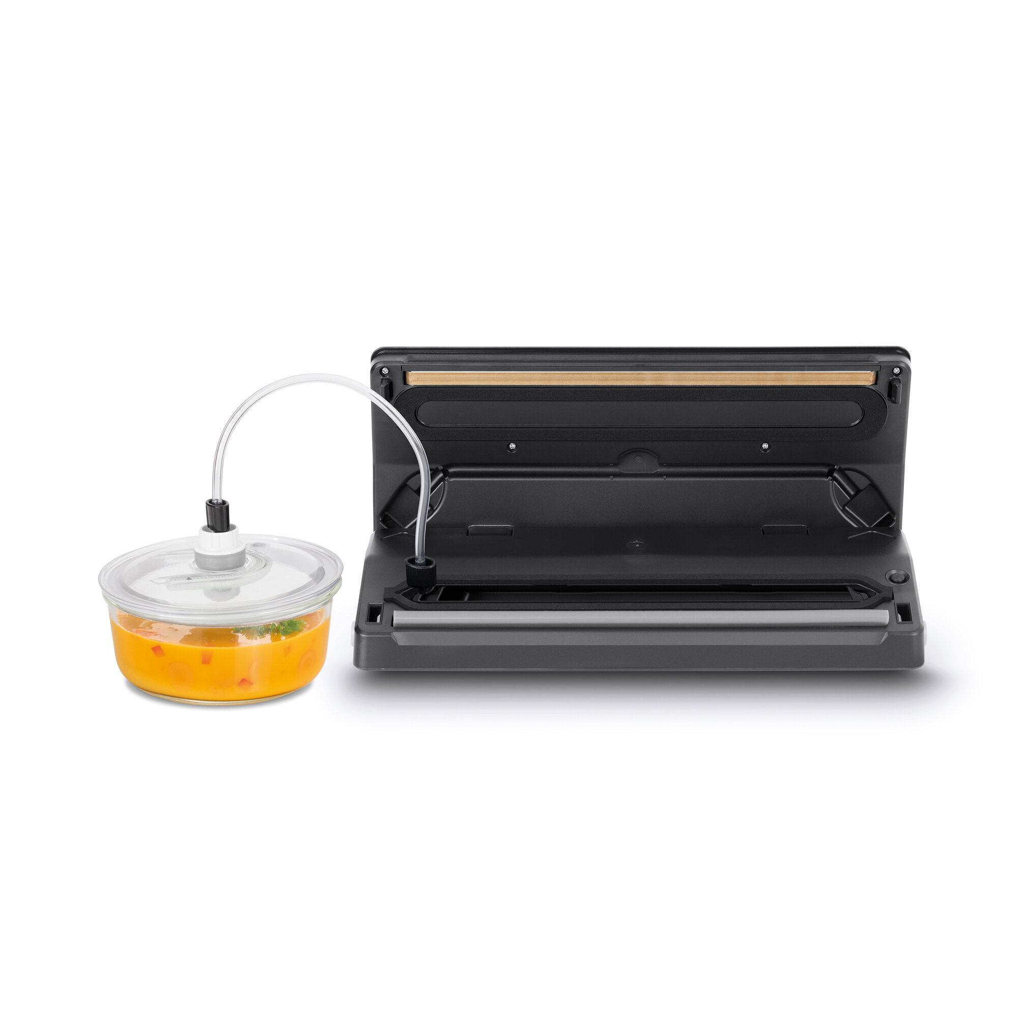 | Прочие особенности и свойства | Для пакетов и рулонов шириной до 30 см.,Крышка с вставкой из нержавеющей стали.,Возможность откачивания воздуха из вакуумных контейнеров.,Электронный контроль температуры запаивания.,В комплекте переходник для контейнеров, 10 пакетов (20 x 30 см). |