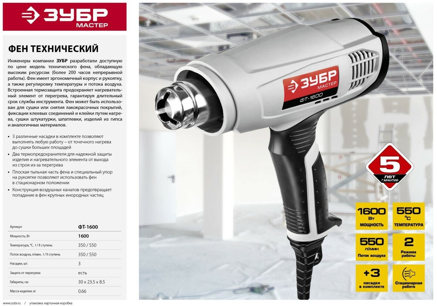 Фен технический Зубр ФТ-1600 коробка