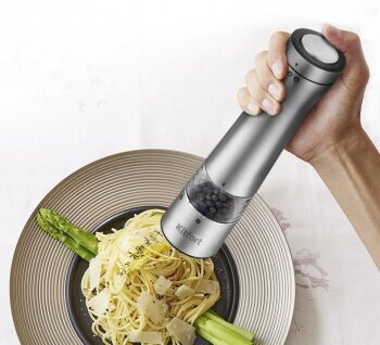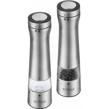 Набор мельниц Kitfort измельчает перец-горошек, соль и другие специи. Нет нужды молоть специи впрок. Мельница одновременно мелет и дозирует. Поместите её над блюдом и просто нажмите кнопку.