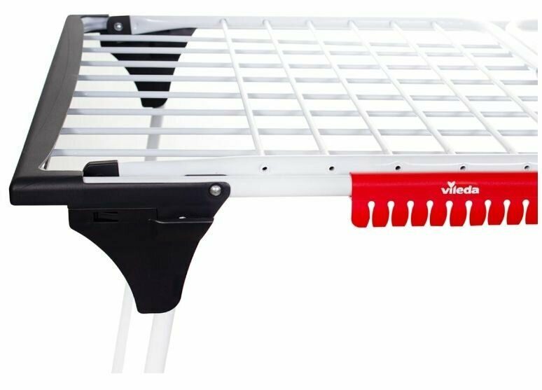 Напольная сушилка для белья КИНГ немецкого бренда Vileda станет незаменимым помощником в Вашем доме. Она легкая и прочная. Изделие изготовлено из высококачественной стали и алюминия с антикоррозийной обработкой. Сушилка компактно складывается, экономя место в квартире. Широкие трубки позволяют минимизировать складки на одежде. Есть держатель для маленьких вещей (носки и пр.). Сушилка не царапает пол, благодаря пластиковым креплениям на стойках.