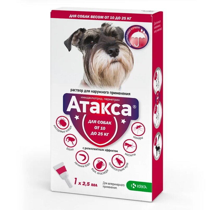 Атакса® — препарат для защиты собак от укусов иксодовых клещей, блох и комаров. Обладает длительным защитным и репеллентным действием: не только уничтожает, но и отпугивает паразитов на протяжении 4 недель!