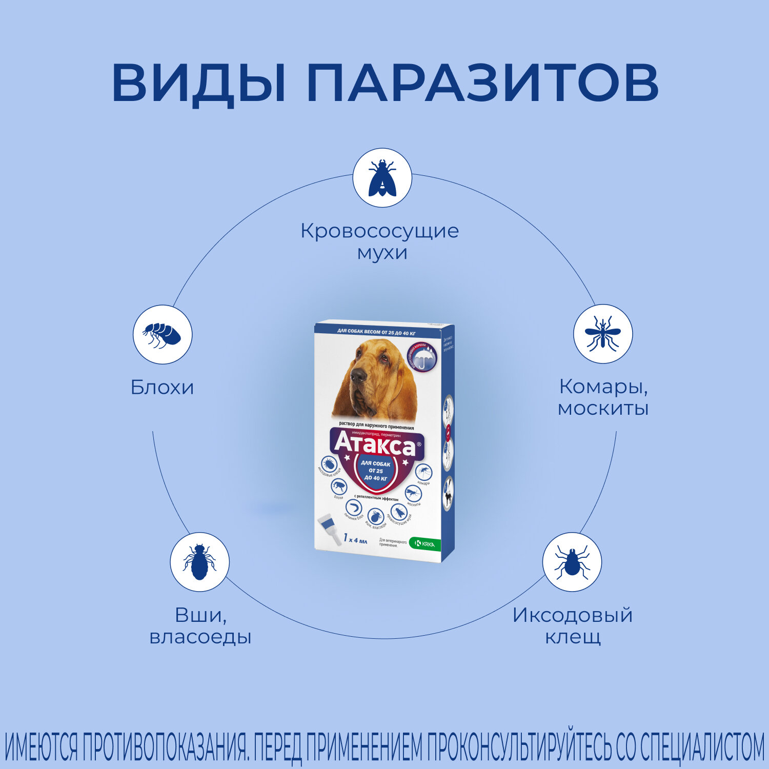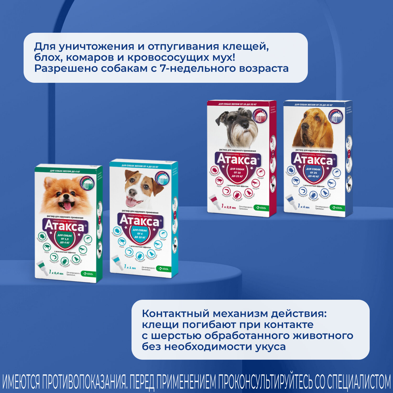 Атакса® — препарат для защиты собак от укусов иксодовых клещей, блох и комаров. Обладает длительным защитным и репеллентным действием: не только уничтожает, но и отпугивает паразитов на протяжении 4 недель!