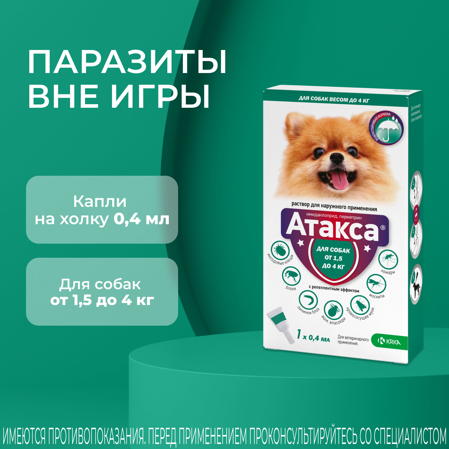 Атакса® — препарат для защиты собак от укусов иксодовых клещей, блох и комаров. Обладает длительным защитным и репеллентным действием: не только уничтожает, но и отпугивает паразитов на протяжении 4 недель!