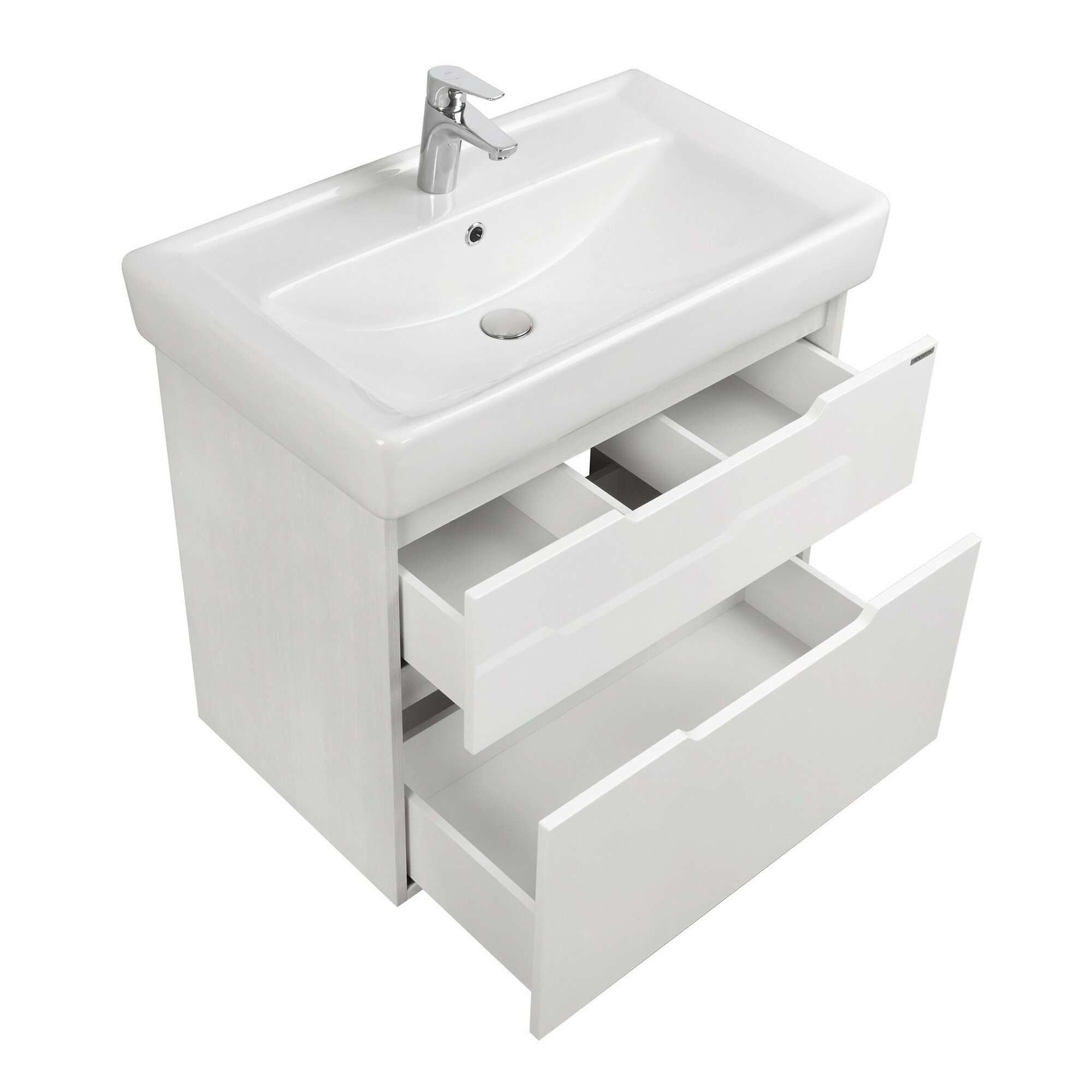 Стильная и современная тумба идеально впишется в ванную комнату практически любого размера. Дизайн модели не предусматривает лицевую фурнитуру – вместо нее на фасадах сделаны удобные вырезы, которые позволяют без труда открыть ящики. Боковые стенки корпуса выполнены из текстурированной ДСП в цвете выбеленное дерево, а фасады тумбы, окрашенные в белый глянец, – из МДФ.