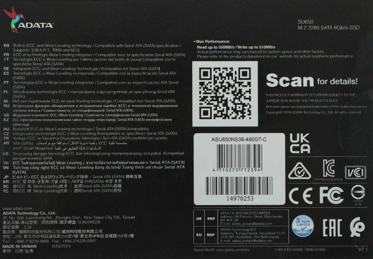 SSD накопитель A-Data Ultimate SU650 480ГБ M.2 2280 SATA III NVMe M.2 ASU650NS38-480GT-C