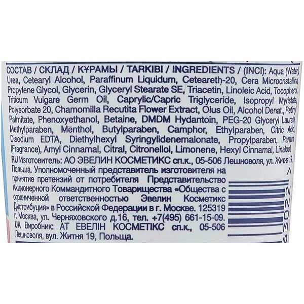 | Состав | water, urea, cetearyl alcohol, paraffinum liquidum, ceteareth-20, cera microcristallina, betaine, glycerin, propylene glycol, glyceryl stearate se, chamomilla recutita flower extract, isopropyl myristate, polysorbate 20, peg-20 glyceryl laurate, tocopherol, linoleic acid, retinyl palmitate, triticum vulgare germ oil, alcohol denat., menthol, camphor, dmdm hydantoin, benzoic acid, sorbic acid, phenoxyethanol, parfum, disodium edta, amyl cinnamal, citral, citronellol, limonene, hexyl cinnamal, linalool |