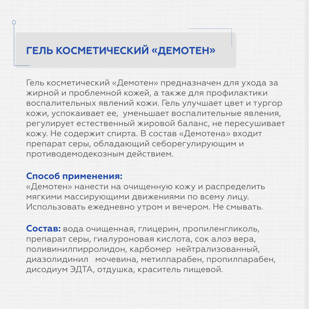 Косметический гель для ухода за жирной и проблемной кожей лица, профилактики демодекоза, акне, угревой сыпи, розацеа и других воспалительных явлений кожи. Гель нормализует салоотделение, снимает воспаления, способствует быстрому заживлению ран. Содержащиеся в «Демотене» препарат серы и Сок Aloe Vera оказывают противовоспалительное действие и способствуют регенерации эпидермиса, гиалуроновая кислота увлажняет кожу, улучшает цвет и тургор кожи. Гель не содержит спирта.