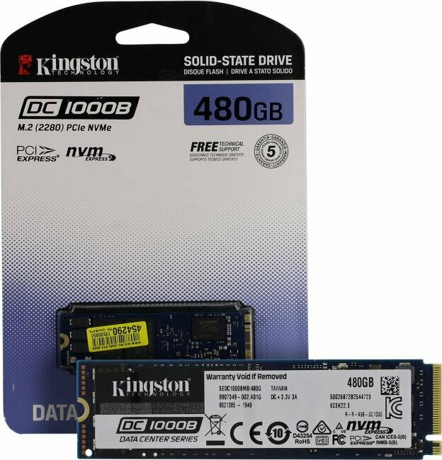 480-гигабайтный SSD M.2 накопитель Kingston DC1000B [] позиционируется производителем в качестве оснащения центров обработки данных. Устройство, использующее для обмена информацией интерфейс PCI-E 3.0 x4, способно обеспечить скоростьтения, максимальное значение которой составляет внушительные 3200 МБ/с. Максимальная скорость записи значительно меньше – 565 МБ/с. Последний показатель, впрочем, заметно превышает пиковую скорость записи абсолютного большинства SATA SSD. SSD M.2 накопитель Kingston DC1000B [] соответствует самому распространенному форм-фактору – 2280. Толщина устройства, имеющего двустороннюю компоновкуипов – 3.8 мм. Используемый ключ – M. Ресурс накопителя составляет 248 TBW. Показатель MTBF – 2 миллионаасов. Энергопотребление устройства не превышает 5.47 Вт. Упаковка накопителя – блистер традиционного конструктивного исполнения.
