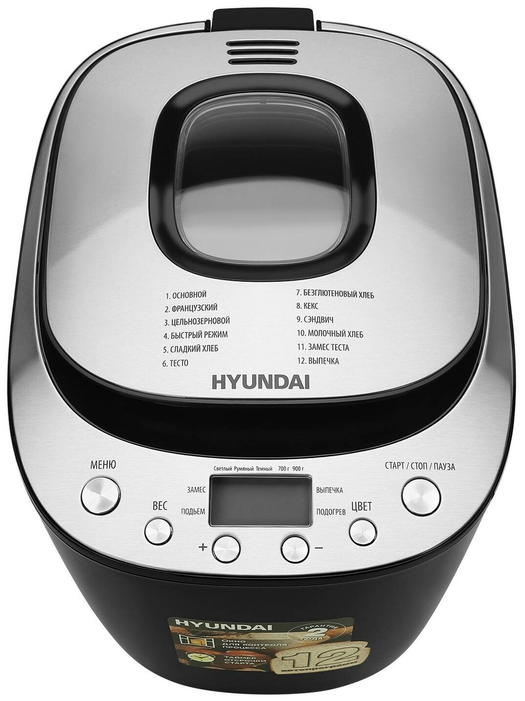 | Прочие особенности и свойства | Хлебопечка Hyundai HYBM-P0212 предлагает 12 программ. Переключаясь между ними, вы можете выпечь различный хлеб – классический белый, французский с начинкой, цельнозерновой, ржаной или безглютеновый.,,ДОПОЛНИТЕЛЬНЫЕ ФУНКЦИИ,Устройство может вымешивать тесто, а также готовить джемы и молочные десерты. С его помощью вы получите полноценный сытный завтрак.,,МАКСИМАЛЬНО ПРОСТО,Панель управления с большим дисплеем и подписями на русском языке позволяет выбрать оптимальные настройки за считаные секунды. Вы можете регулировать вес буханки и степень прожарки корочки, а также устанавливать таймер отложенного старта.,,ВСЁ ПОД КОНТРОЛЕМ,Любите следить за процессом приготовления? В вашем распоряжении большое прозрачное окно в крышке. |