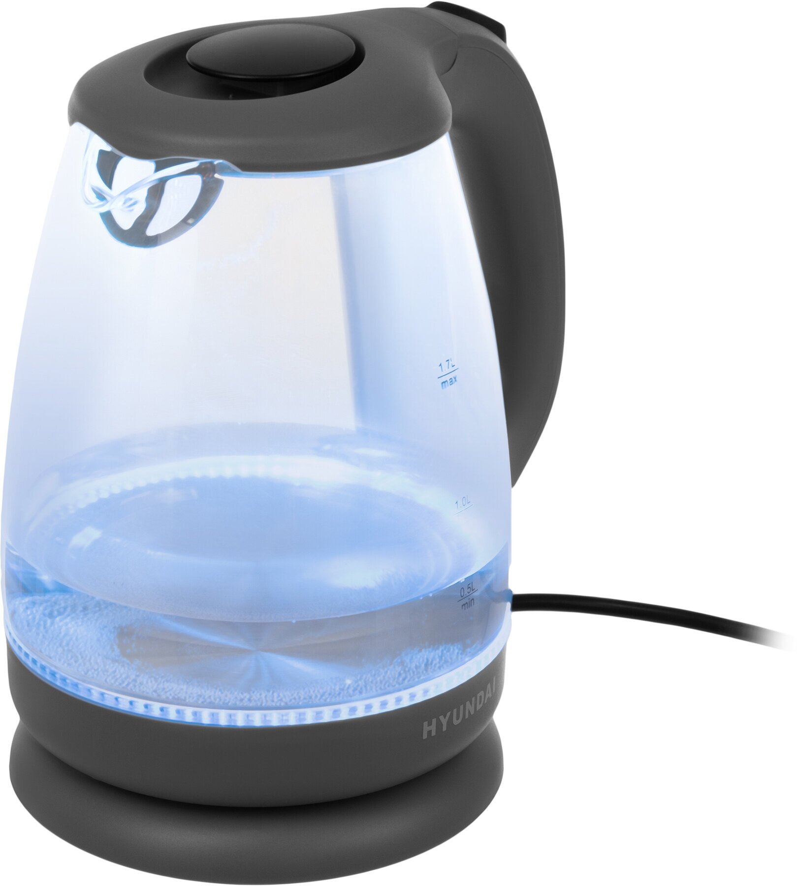 HYUNDAI 1.7 л Black, Transparent изготовлен из термостойкого стекла, которое обеспечивает долговечность и безопасность использования. Кроме того, внутренняя подсветка делает процесс кипячения воды еще более зрелищным и эстетичным.
