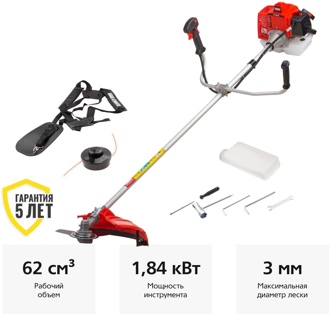 | Дополнительная комплектация | Мотокоса - 1 шт.; катушка с леской - 1 шт.; нож для травы - 1 шт.; наплечный ремень - 1 шт.; емкость для приготовления топливной смеси - 1 шт.; набор инструментов для обслуживания - 1 шт.; инструкция по эксплуатации - 1 шт. |
