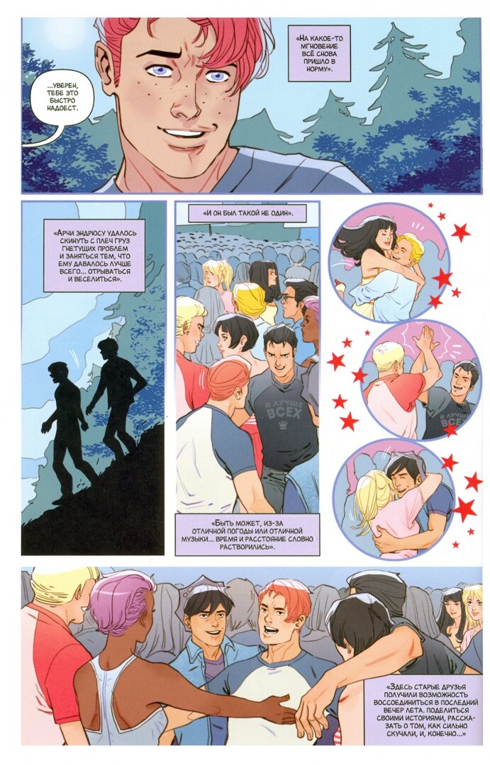 У автора комикса Ника Спенсера я читал "Совершенные враги человека паука", которые меня оставили совершенно равнодушным. Поэтому, как давнишний поклонник Арчи, я с некоторой опаской открыл данное произведение. И могу сказать: Спенсер справился - легкий повествовательный стиль сохранен, ненавязчивый и непохабный юмор тоже.