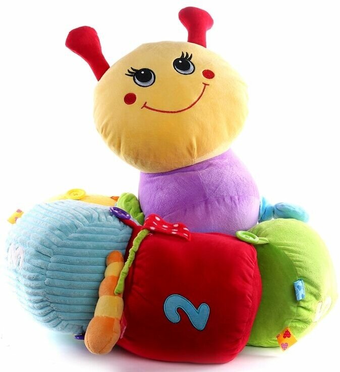 Красивая, улыбчивая и приятная на ощупь многофункциональная игрушка Гусеница Мари состоит из 6 частей, которые скрепляются между собой с помощью пуговиц.