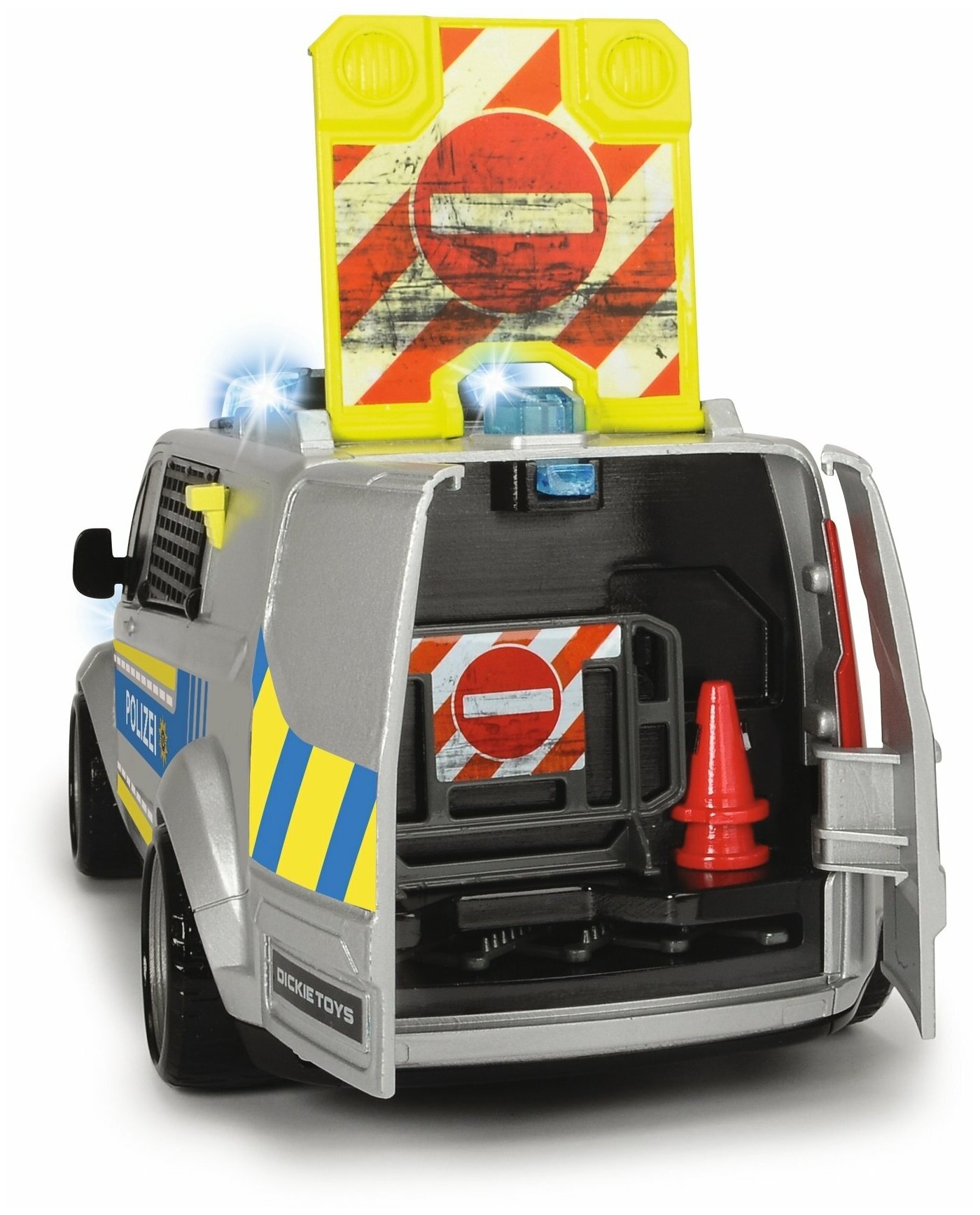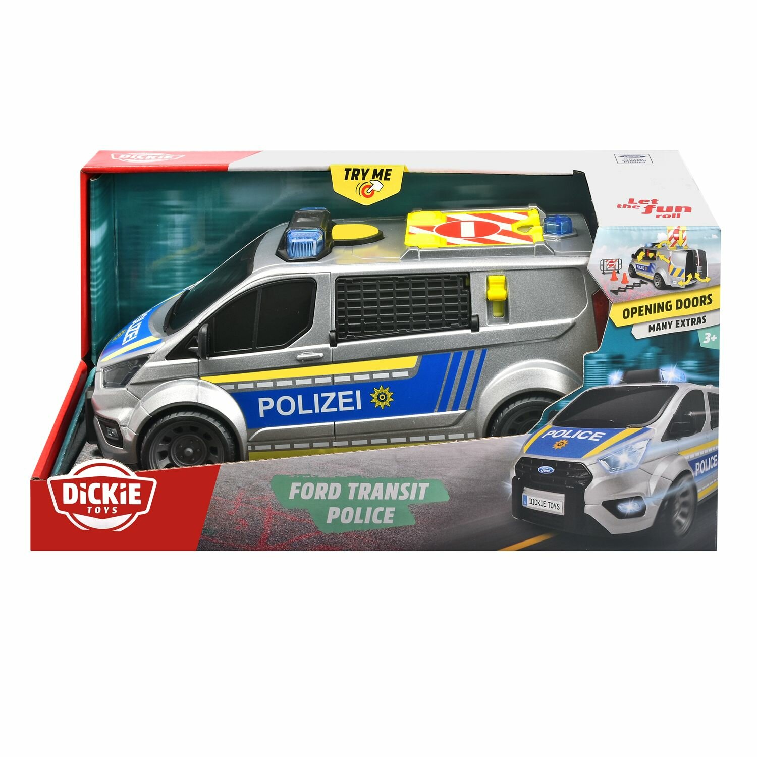 Полицейский фургон со свободным рулем имеет открывающиеся двери и подпружиненную заднюю дверь. Свет и звук также доступны при нажатии кнопки.