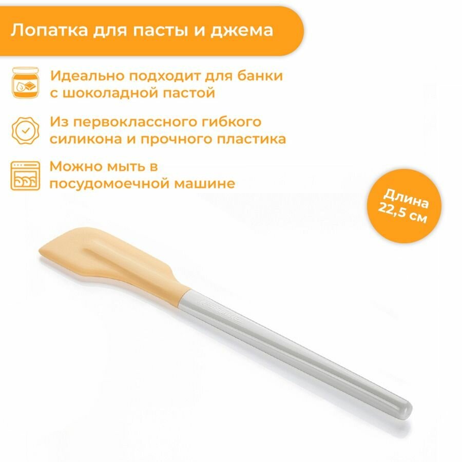 Tescoma Delicia - это удобная и практичная лопатка для орехового крема. Она идеально подходит для легкого и равномерного распределения ореховых паст, шоколадных кремов и других продуктов для выпечки. Изготовлена из высококачественных материалов - гибкого силикона и прочного пластика. Благодаря этому, она легко моется в посудомоечной машине и сохраняет свою форму и цвет на долгое время. Лопатка Delicia имеет длину 22,5 см и удобный размер для использования. Ее можно использовать для приготовления десертов и выпечки, чтобы сделать их более вкусными и аппетитными. Она также может быть использована для создания различных соусов и заправок, которые станут настоящим украшением любого блюда. Преимущества этой лопатки заключаются в ее гибкости и прочности. Она легко принимает нужную форму и позволяет равномерно распределить крем или соус на поверхности блюда. Кроме того, лопатка Delicia очень проста в использовании и не требует особых навыков и умений.