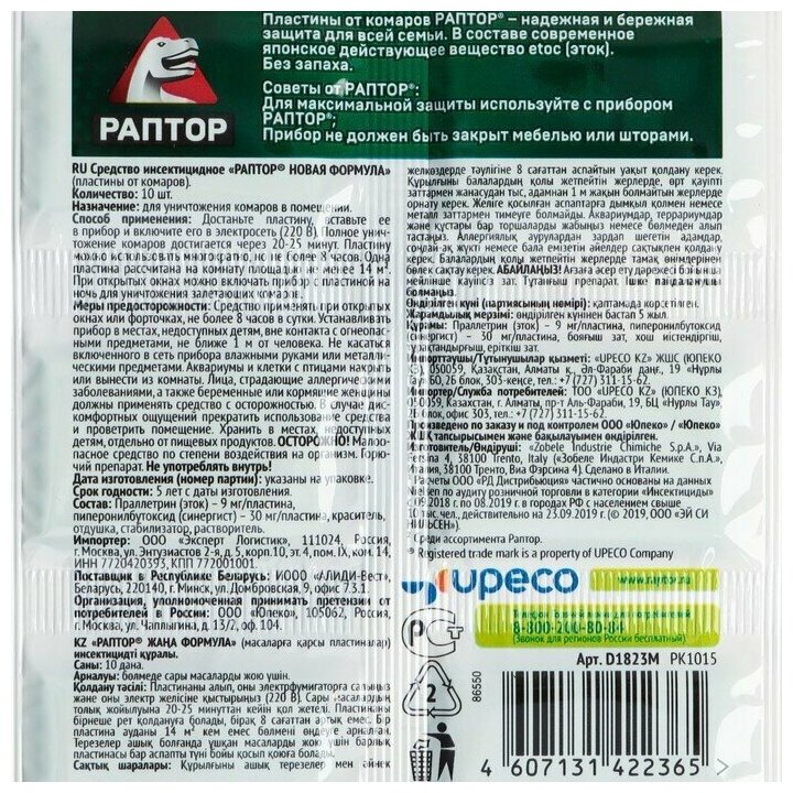 Принцип действия пластины очень прост: при включении фумигатора в электросеть происходит постепенное нагревание пластины от керамического нагревательного элемента прибора, в результате чего начинается процесс равномерного испарения действующего вещества в воздух. Молекулы инсектицида контактируют с пролетающими насекомыми через дыхательные пути и хитиновый покров, что способствует их уничтожению. Etoc (эток) – высокоэффективное вещество, формула которого была разработана в Японии. На насекомых эток действует как сильное нервнопаралитическое средство. Для людей и домашних животных оно совершенно безвредно (из-за значительной разницы в массе тела человека/животного и насекомого). Средство применять в хорошо проветриваемых помещениях или при открытых окнах не более 8 часов; в закрытых помещениях не более 2-х часов в отсутствие людей с последующим проветриванием. Лица, страдающие аллергическими заболеваниями, должны применять средство с осторожностью. Не касаться включенного прибора влажными руками и металлическими предметами. Включать прибор на расстоянии не менее 1 метра от спящих людей. При появлении дискомфортных ощущений необходимо прекратить использование средства и хорошо проветрить помещение. При наличии в комнате аквариума необходимо плотно закрыть его на время работы прибора.Состав: Эток 9 мг/мат, синергист 3 мг/мат, краситель, отдушка, стабилизатор, растворитель.Инструкция по применению: Достаньте пластину Раптор из упаковки и вставьте ее в нагревательный прибор Раптор. Включите нагревательный прибор в электросеть (22 В). Пластина начинает действовать через 1-15 минут после включения. Полное уничтожение комаров достигается через 2-25 минут. При открытых окнах или окнахах рекомендуем оставить прибор с пластиной включенным на всю ночь для уничтожения залетающих насекомых. После окончания работы выключите прибор из сети. Одна пластина рассчитана на 8 часов эффективной работы, независимо от количества включений прибора в сеть.