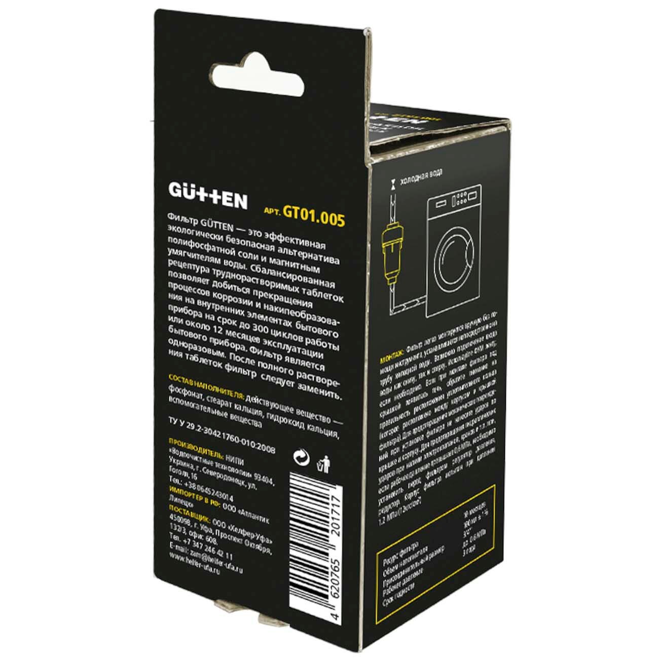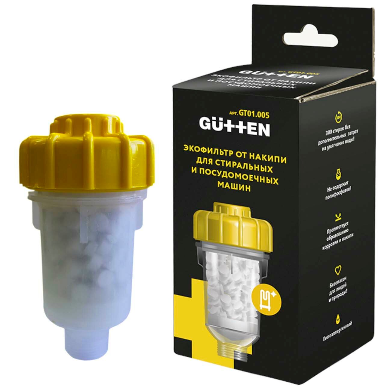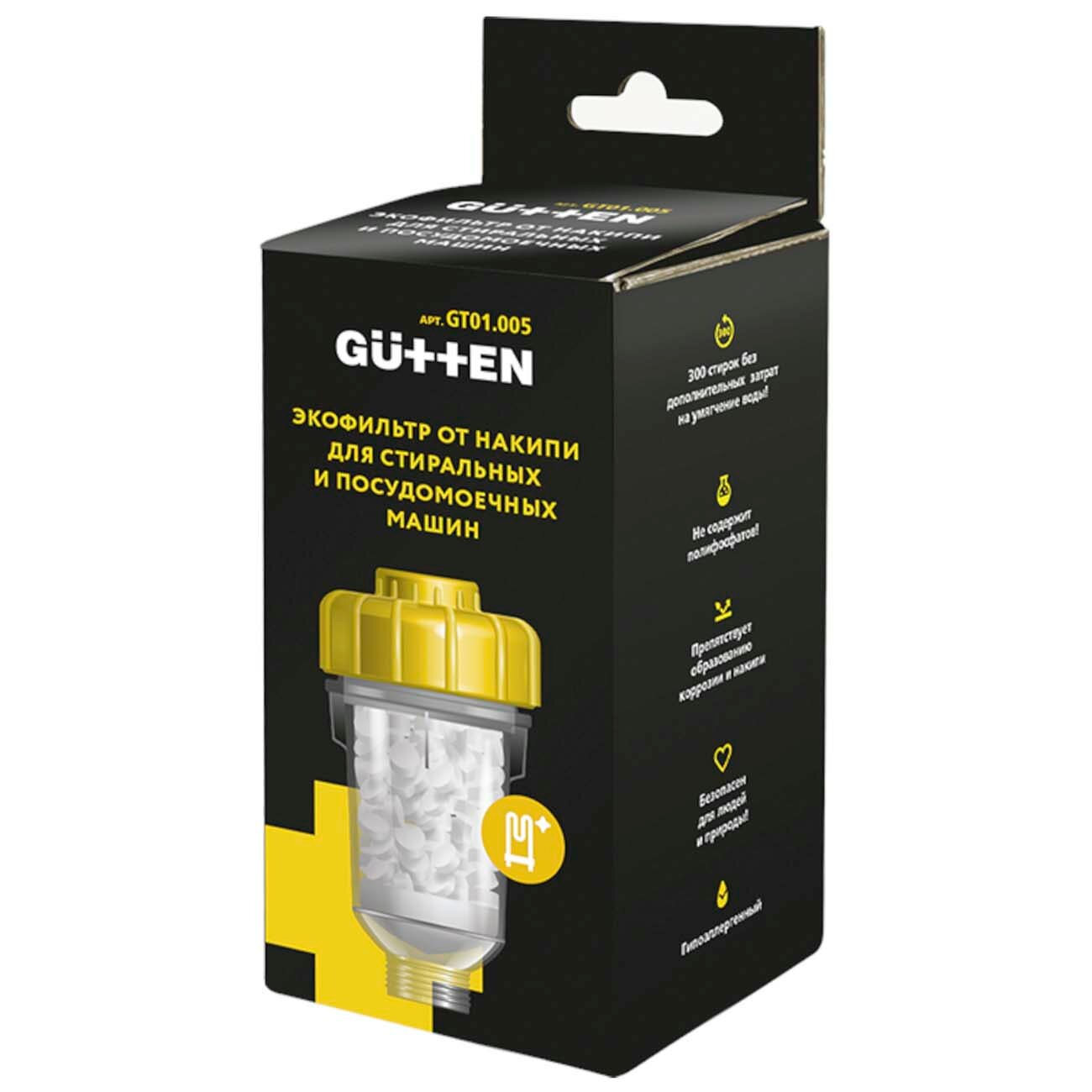 Фильтр Gutten активно очищает и смягчает воду, увеличивая срок службы стиральной машины. Сбалансированная формула вещества препятствует образованию ржавчины и накипи. Аксессуар легко устанавливается в устройство, не занимая много места. безопасность Экологичные компоненты не наносят вреда человеку и окружающей среде, являются гипоаллергенными. Таблетки полностью растворяются в воде, не оставляя налёта. Фильтр рассчитан на длительный период: около 12 месяцев использования.