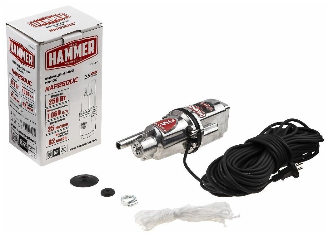 Насос вибрационный Hammer NAP250BC(16) 250Вт 1110л/ч высота 72м кабель 16м нижний забор воды. Предназначен для подъема воды из колодцев и скважин внутренним диаметром от 100 мм, а также перекачки пресной воды температурой до 40C из различных водоемов.