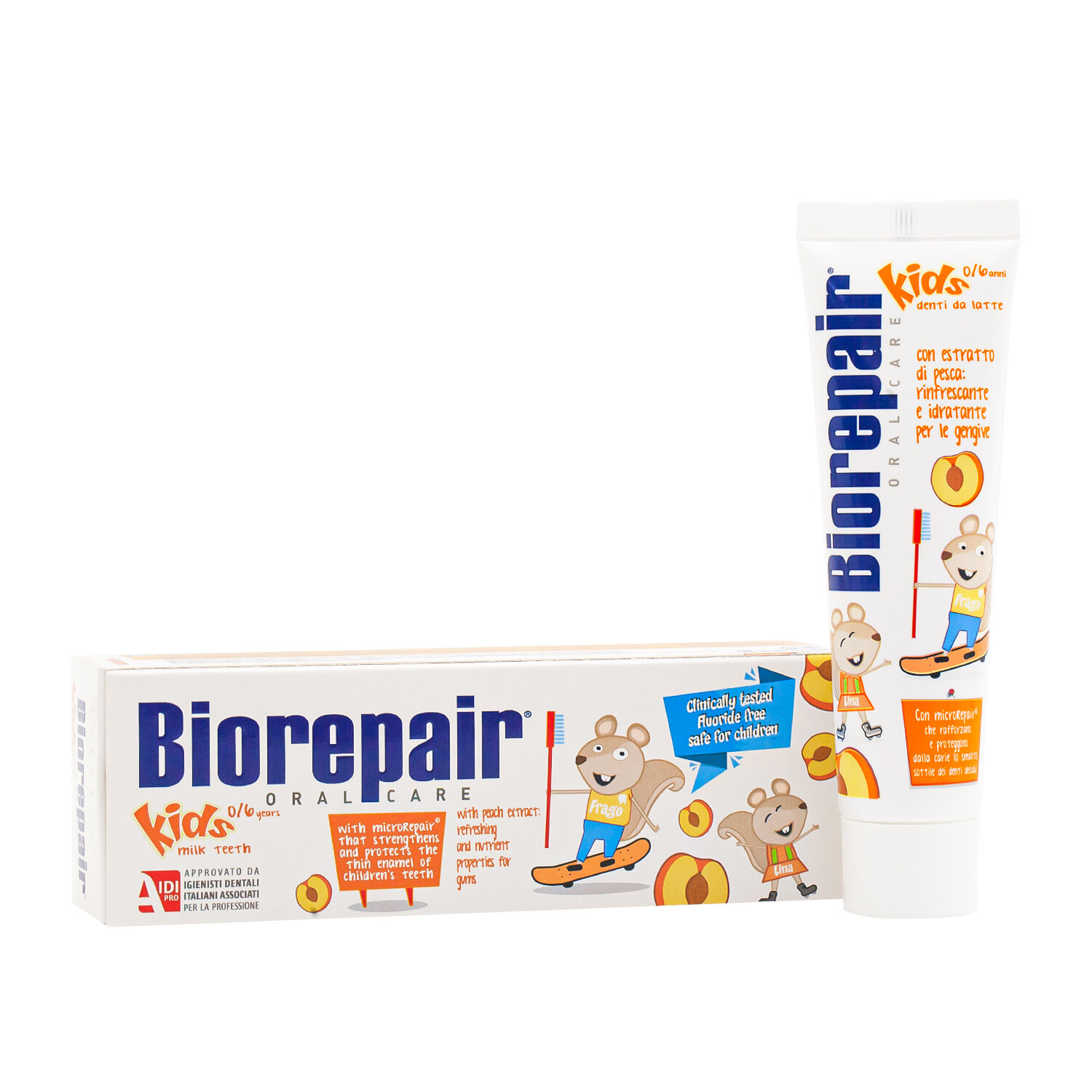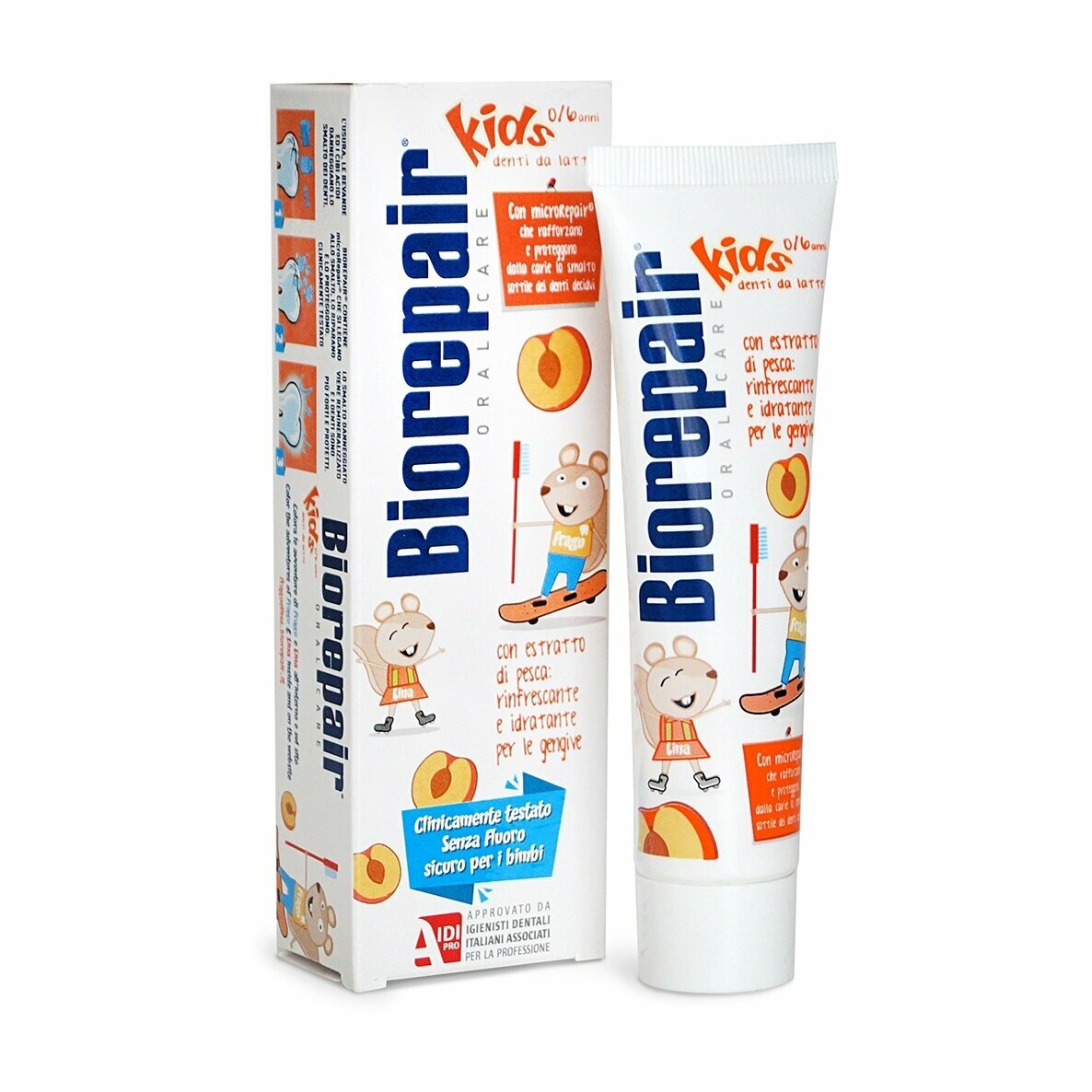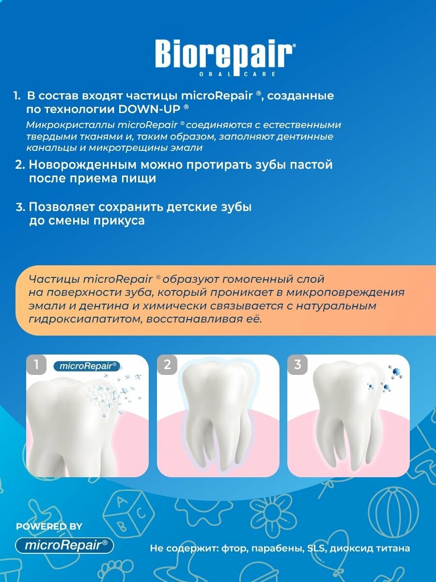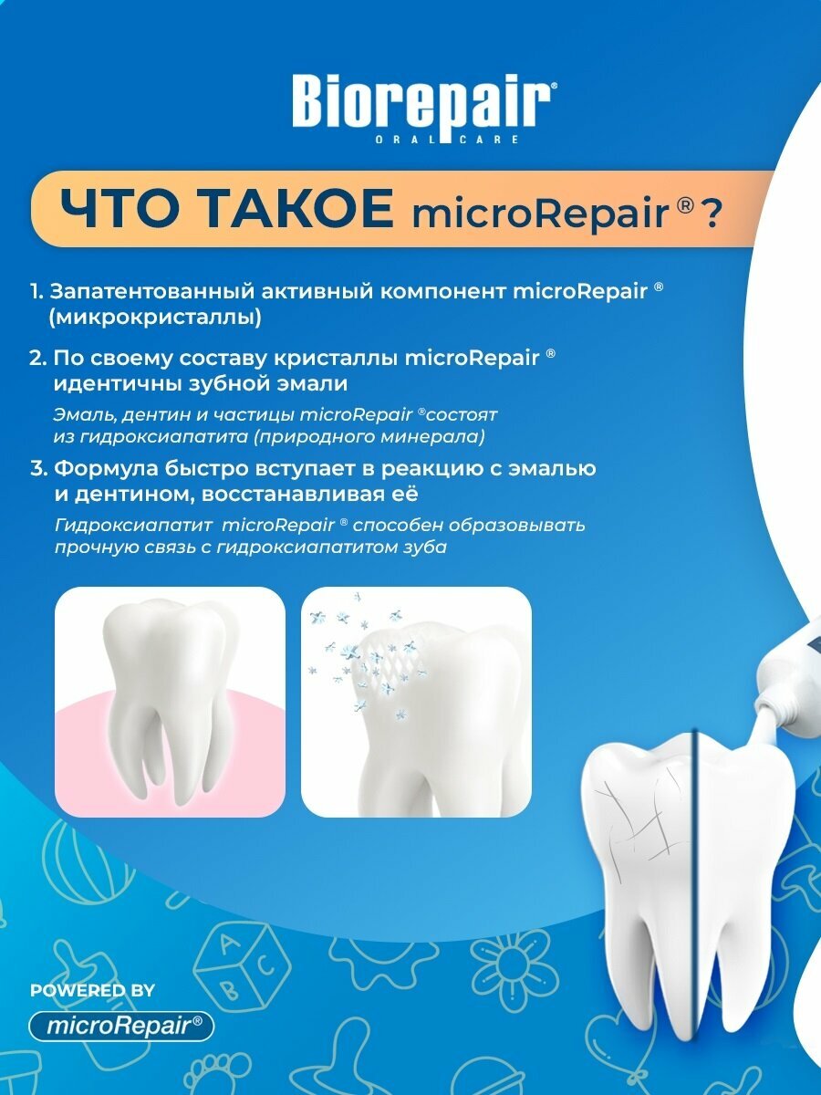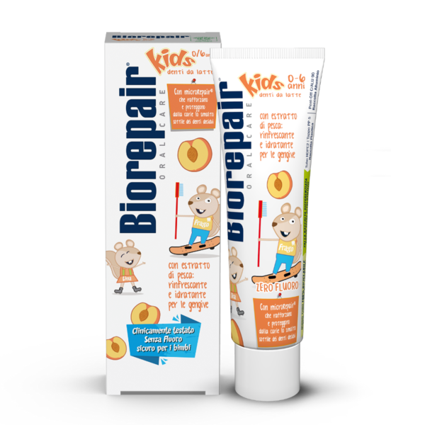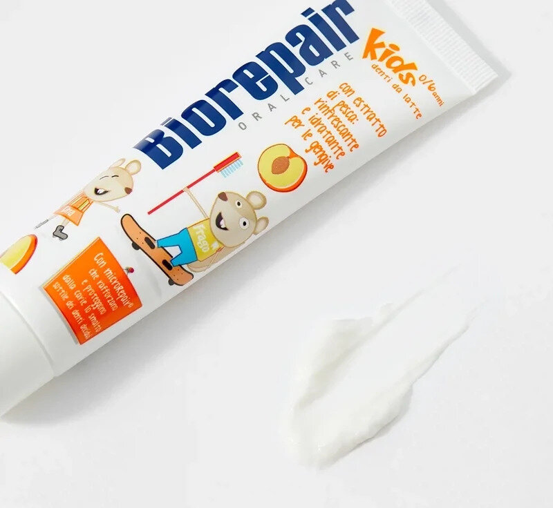 Детская зубная паста Biorepair Kids с экстрактом персика защищает зубы от кариеса и идеально подходит для гигиены молочных зубов. Эмаль детских зубов более тонкая и уязвимая, чем эмаль постоянных зубов. Поэтому очень важно восстанавливать эмаль и защищать ее от воздействия кислот и сахаров. BiorepairKids – единственная зубная паста, содержащая частицы microRepair, которые укрепляют эмаль молочных зубов, способствуя правильному развитию и здоровью постоянных зубов. Ее эффективность клинически-протестирована. Исключительно деликатная формула BiorepairKids содержит экстракт персика, который освежает и питает десны.