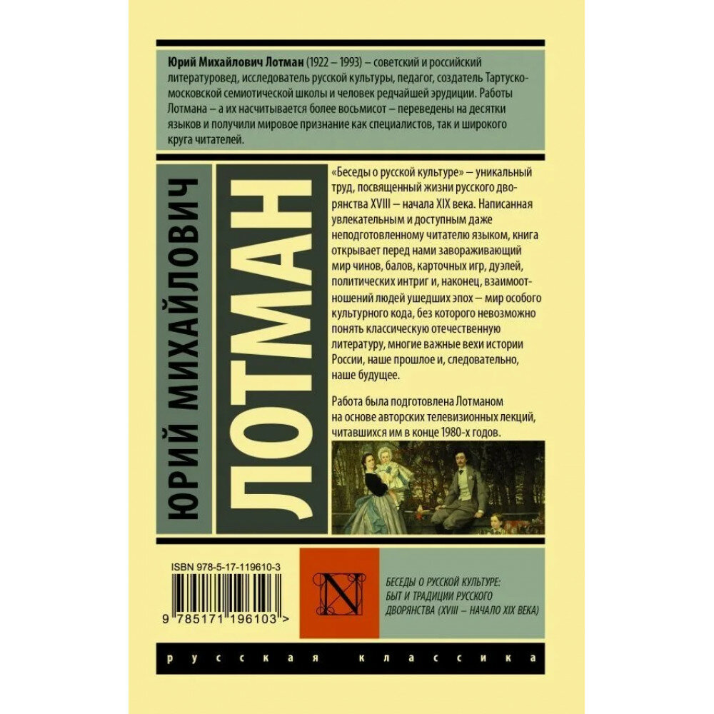 Юрий Михайлович Лотман российский литературовед, написавший более 800 работ, в числе которых есть и лекции о культуре, и литературные статьи. Его "Беседы о русской культуре" можно назвать некой "энциклопедией русской жизни XVIII - XIX веков". Расцвет русской литературы пришелся именно на этот период, а чтобы понять основной замысел, главную идею произведений разных авторов, читатель должен хорошо знать культурно-исторический контекст эпохи, в которую был написан литературный текст. Поэтому, на мой взгляд, эта книга Лотмана является отличным "путеводителем" для тех, кому важно изучить произведение досконально. Книга написана довольно доступным языком, поэтому если вам не так важна литература, а просто имеется интерес к этому тексту с исторической точки зрения - вам тоже ее можно посоветовать, в качестве еще одного взгляда на дворянство того времени.