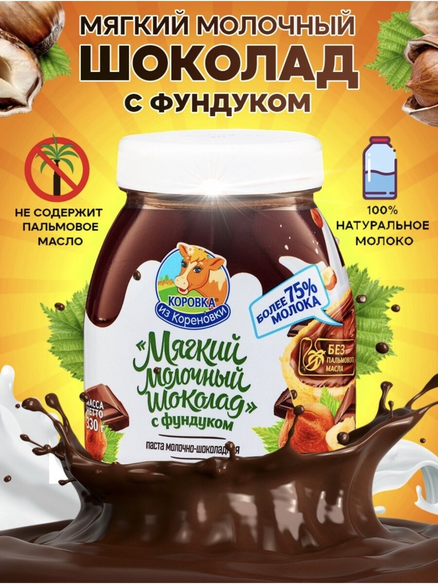 Сервис сравнения цен СкидкаГИД предлагает сравнить цены на товар «Паста Коровка из Кореновки Мягкий молочный шоколад с фундуком 330г»