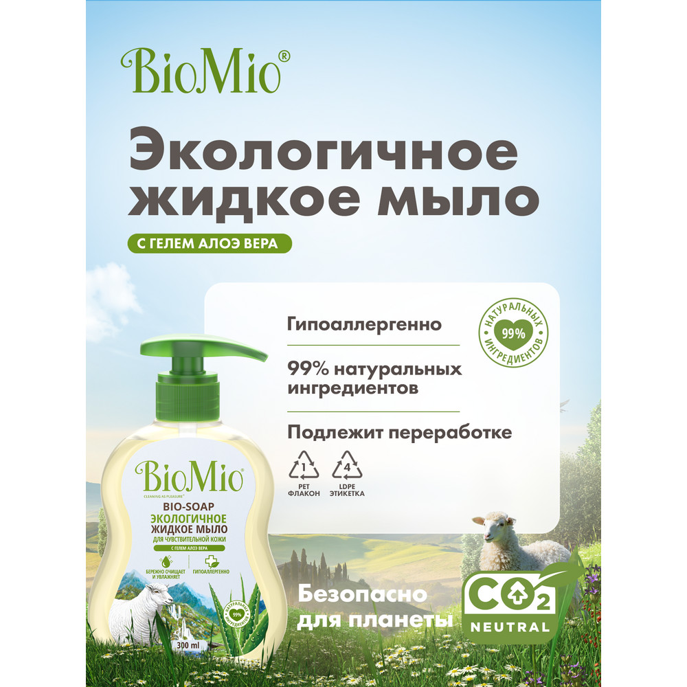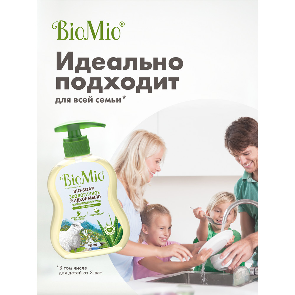 Антибактериальное гипоаллергенное жидкое мыло для рук и тела BioMio Bio-Soap Sensitive с гелем алоэ вера 300 мл