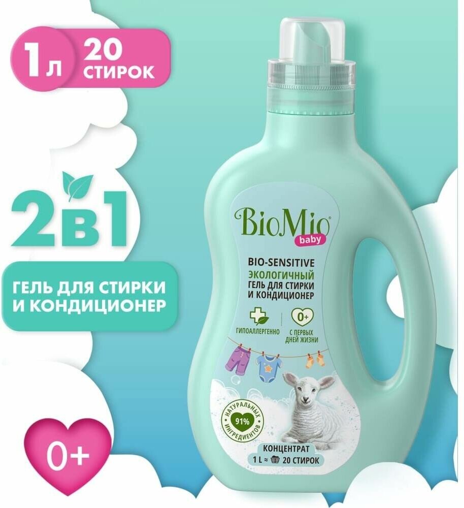Экологичный гипоаллергенный гель и кондиционер для стирки детского белья 2 в 1 BioMio Baby Bio-Sensitive концентрат 1 л