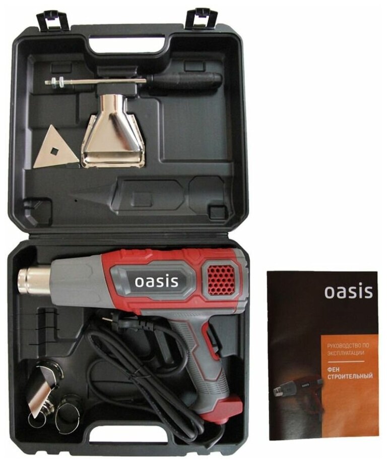 | Прочие особенности и свойства | Строительный фен Oasis TG-20Е предназначен для удаления лакокрасочных покрытий, усадки термоусадочных шлангов, формования, сварки пластмасс. Также Oasis TG-20Е используется для пайки и лужения, отогревания водопроводов, разделения клееных соединений и сушки влажной древесины. Срок службы - 5 лет., , Пользователи оценят:, , Износостойкий двигатель выдерживает высокие нагрузки и обладает мощностью 2000 Вт., Цифровой дисплей имеет индикаторы перегрева и мощности воздушного потока., Oasis TG-20Е имеет два режима работы с плавной регулировкой рабочей температуры и воздушного потока:, 1 режим - рабочая температура 60°C, расход воздуха 300-500 л/мин;, , 2 режим - рабочая температура 60-600°C, расход воздуха 300-500 л/мин., , Защита от перегрева увеличивает срок службы инструмента., Сетевой кабель устойчив к перегибам и выдерживает низкие температуры., Малый вес инструмента снижает энергоёмкость рабочего процесса., Рукоятка удобной формы обеспечивает надёжное удержание инструмента в руке во время работы., 4 насадки в комплекте |