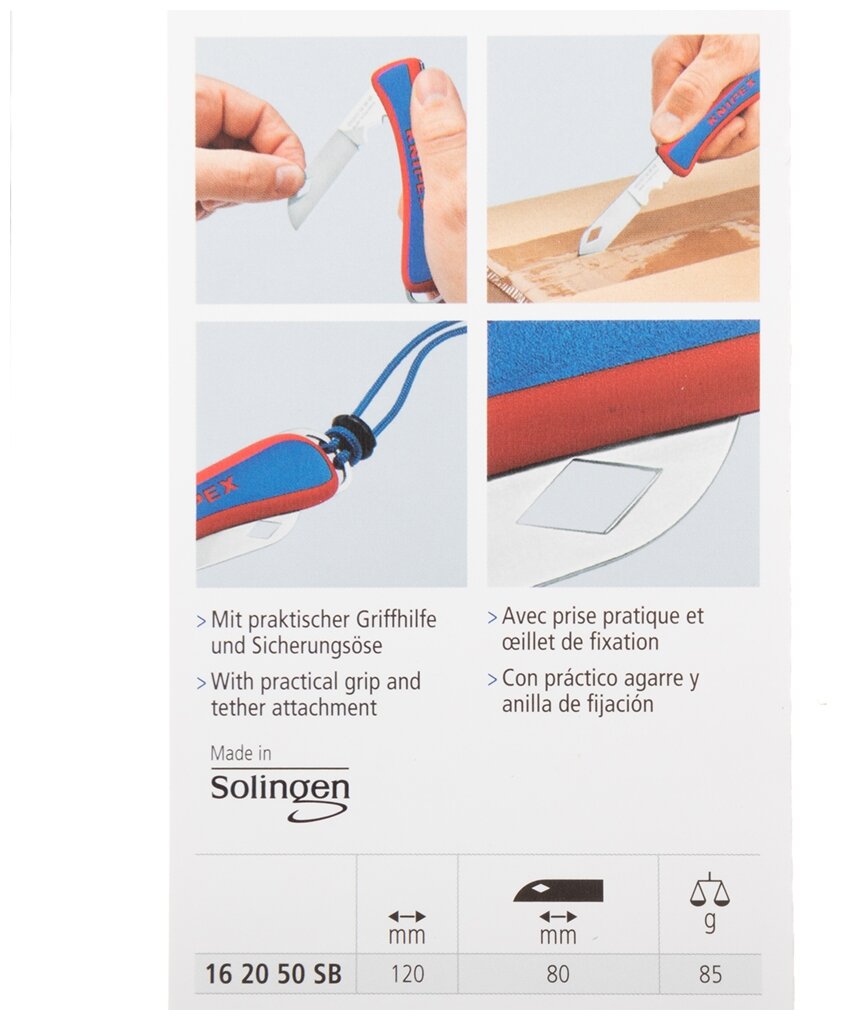 Универсальный складной нож для повседневного пользования, прочный и надежный: высочайшее качестве, чрезвычайно острое лезвие из нержавеющей стали - Сделано в Золингене.Эргономичная рукоятка из ударопрочного пластика.Отличная передача усилия в ходе использования.Крепление на конце инструмента позволяет пристегнуть карабин системы KNIPEX Tethered Tools*.