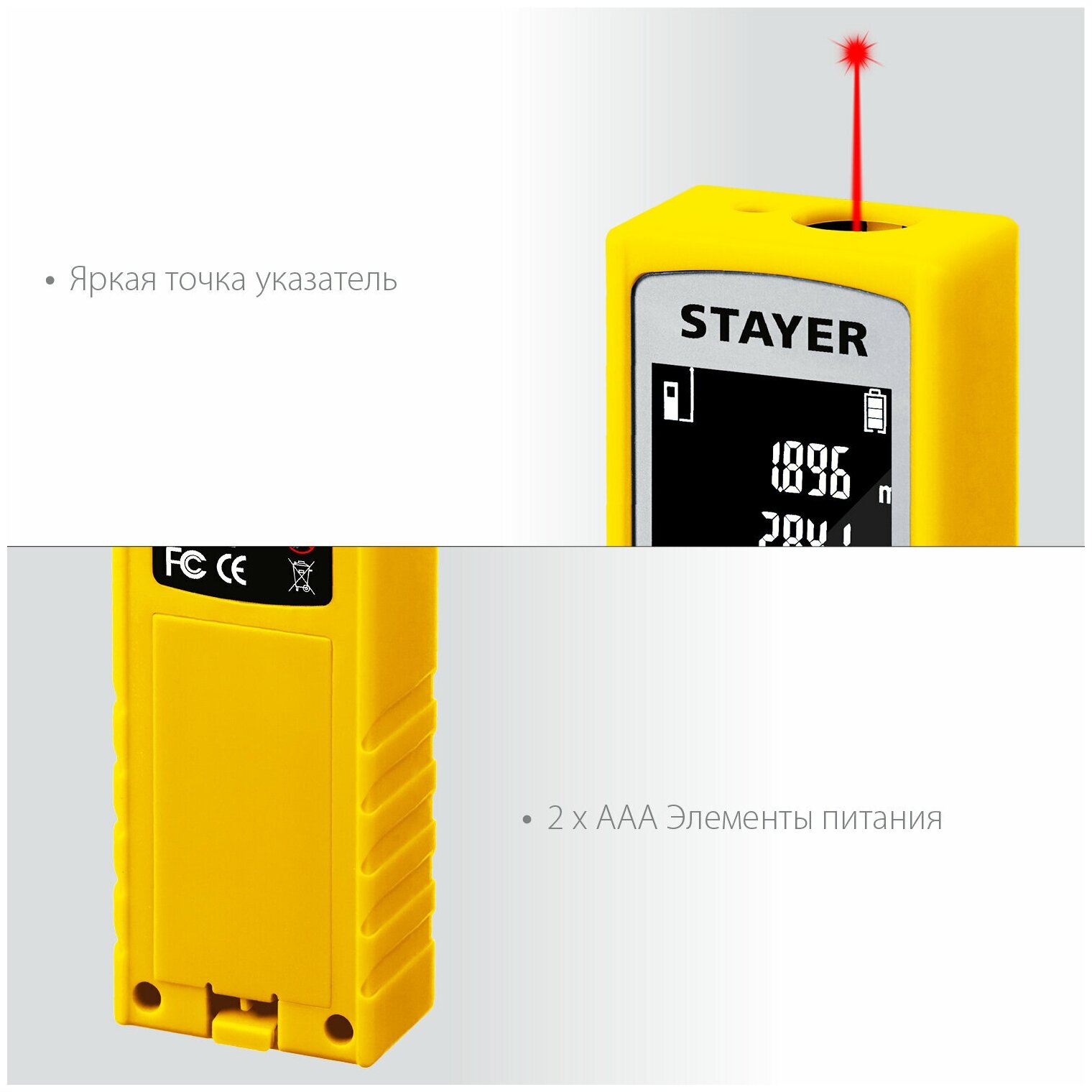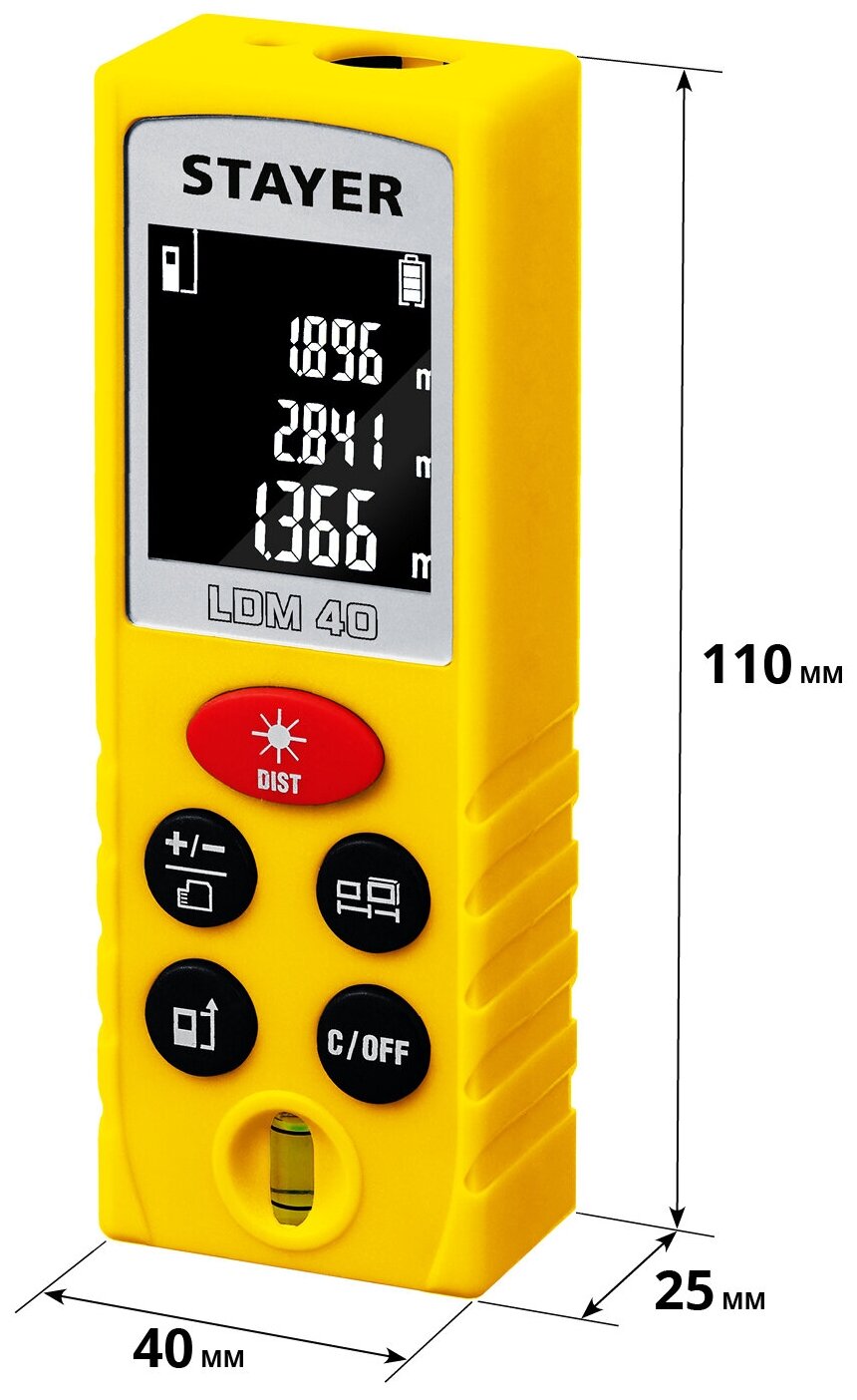 Дальномер лазерный STAYER LDM-40 (34956), предназначен для быстрого и простого измерения линейных расстояний, площадей и объемов. Позволяет проводить весь цикл измерений одному человеку, значительно ускоряя выполнение разметочных работ и повышая надежность полученных данных.